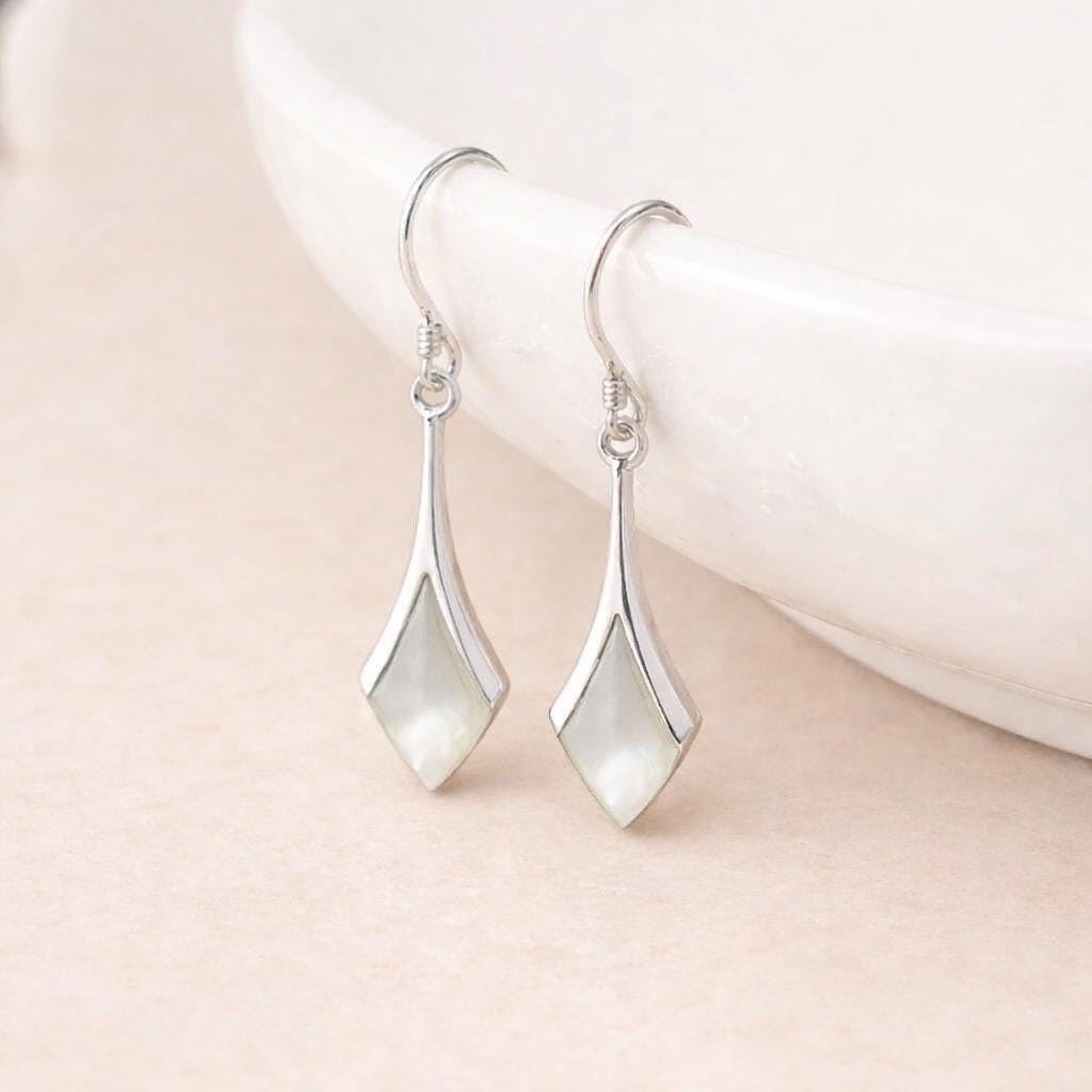 The elongated diamond shaped drop is framed in polished sterling silver, creating a clean, modern silhouette that gently tapers to a refined point. Suspended from classic silver hook fittings, the earrings move beautifully with wear, catching the light across the smooth nacre surface. With a drop height of 30mm and a width of 9mm, they provide noticeable presence while remaining comfortable at approximately 2.40g per pair.