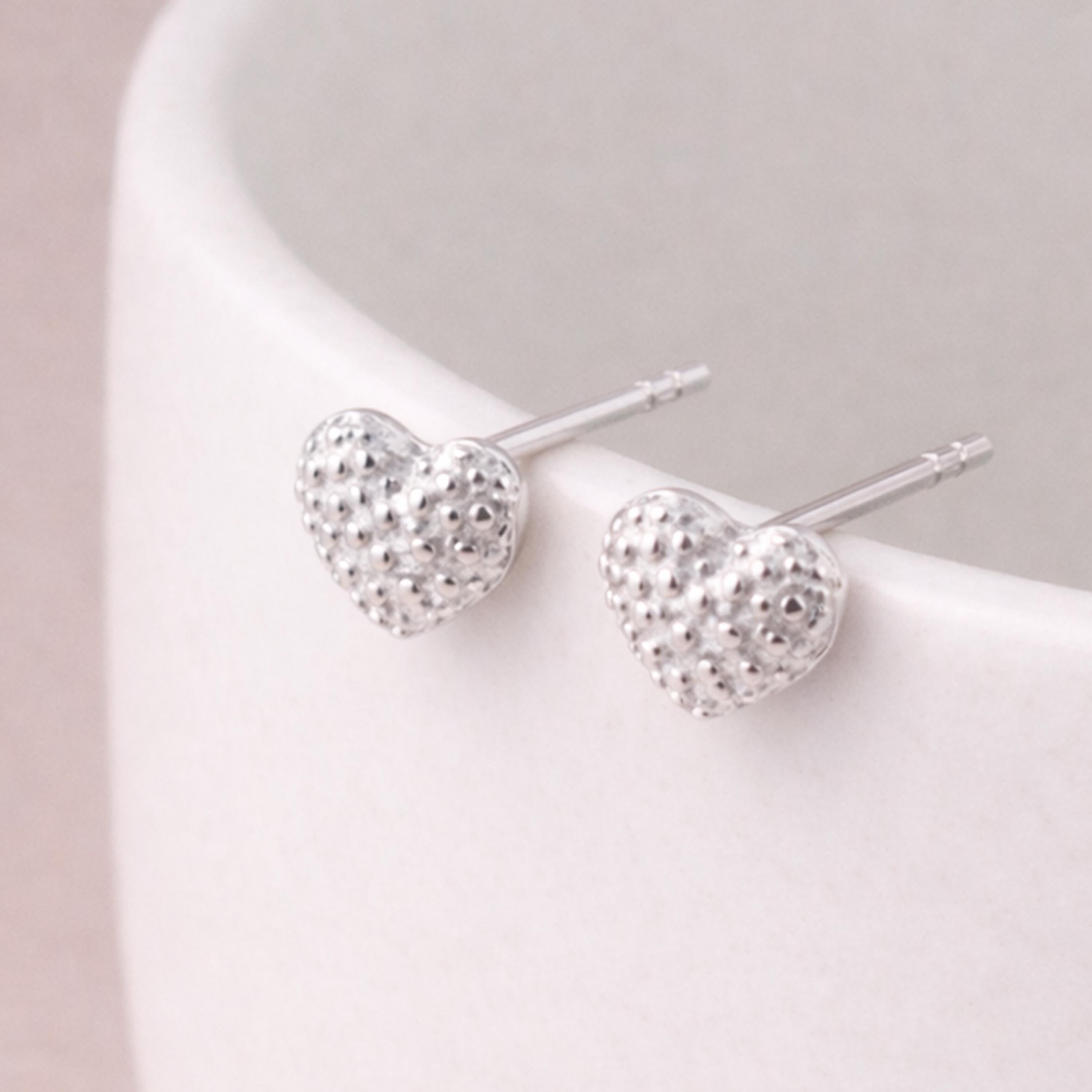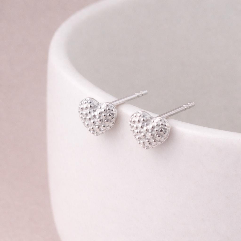 These Textured Heart Stud Earrings are crafted from solid 925 sterling silver and finished in a bright, polished silver tone with a beautifully detailed dimpled surface. Measuring 6mm by 6mm, they are perfectly sized for subtle everyday wear while still offering eye catching texture.