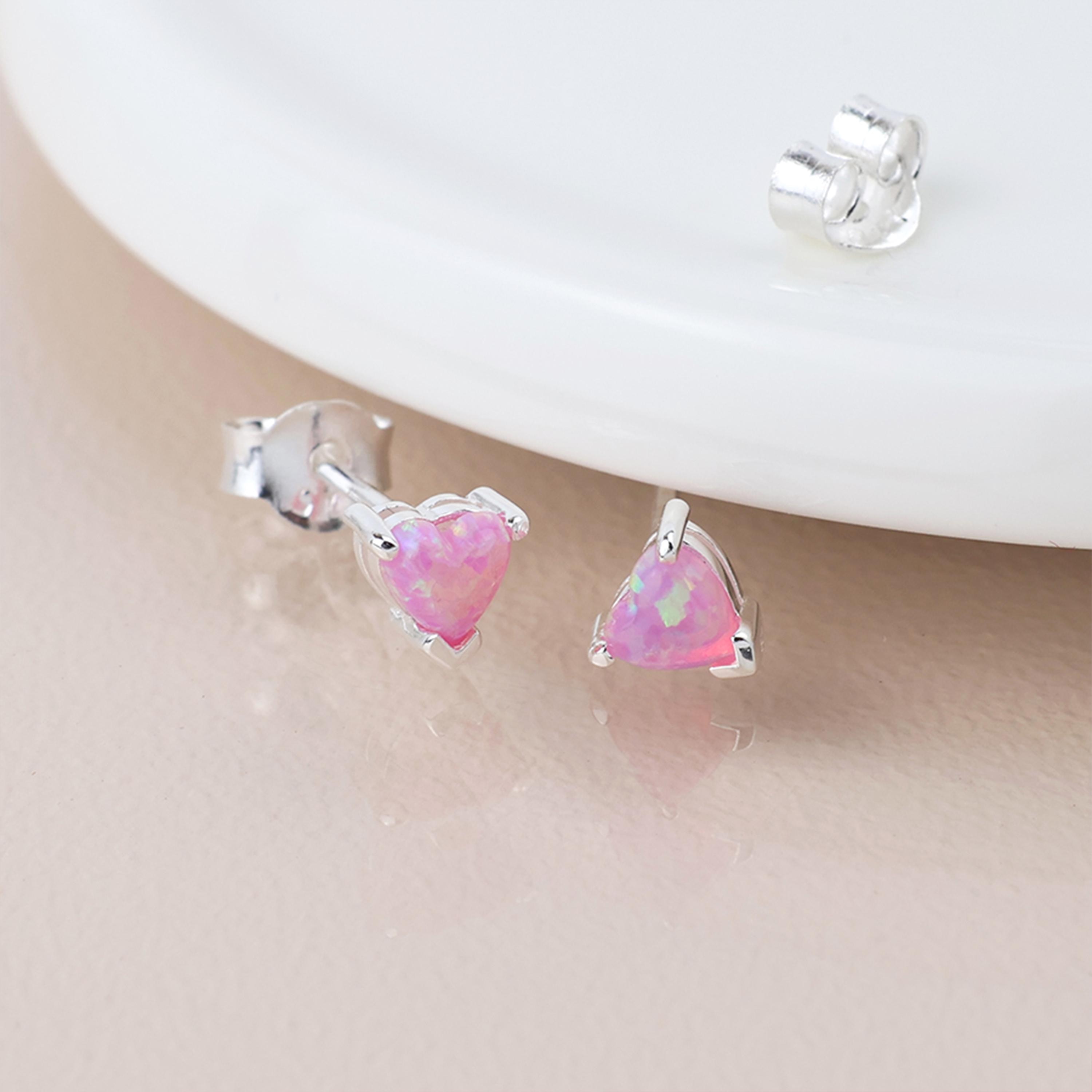Each heart shaped opal is securely held in a classic claw setting, allowing maximum light to pass through the stone and enhance its natural play of colour. The polished sterling silver setting provides a clean, bright frame that beautifully contrasts with the pink tones of the opal. At just 0.40g, they are lightweight and comfortable, making them ideal for everyday wear, second piercings, or for younger jewellery lovers.