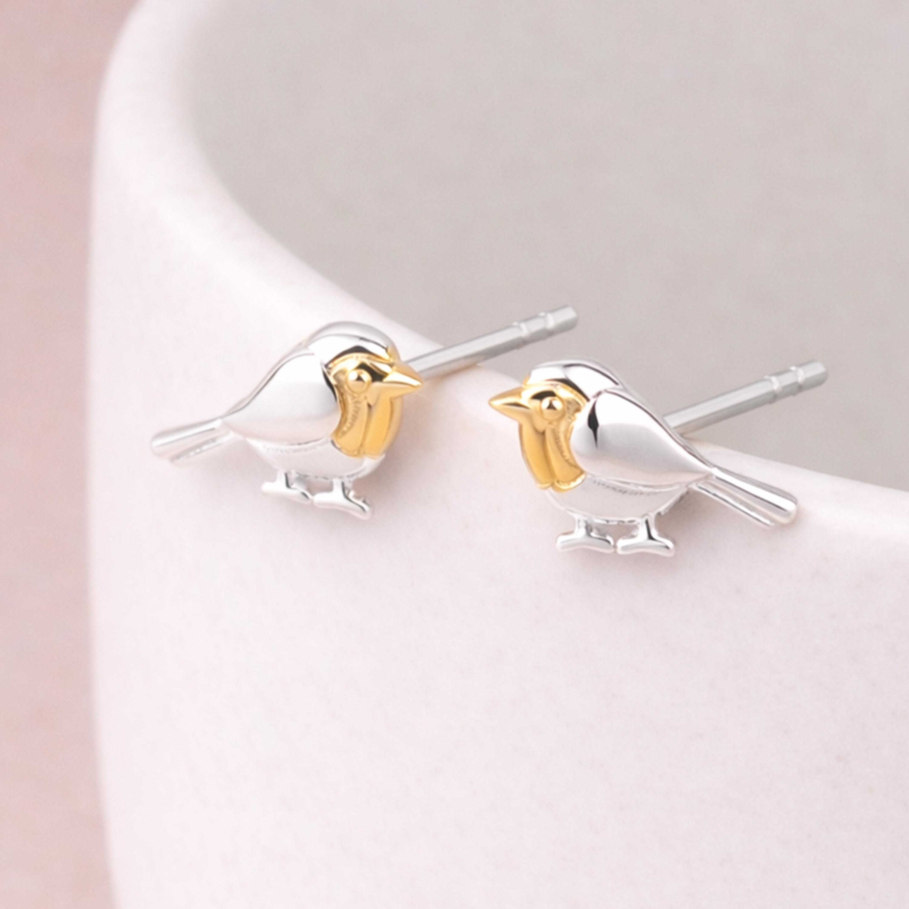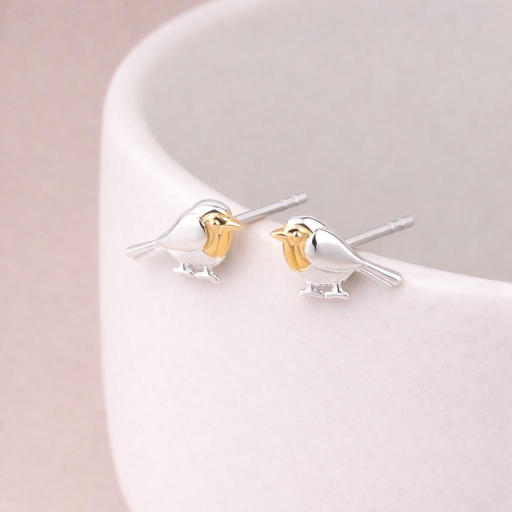These Robin Bird Stud Earrings are crafted from solid 925 sterling silver with 18ct yellow gold plating and feature a beautifully detailed two tone design in bright silver and warm gold. Measuring 10mm wide by 7mm high, they offer a charming yet refined silhouette that sits neatly on the lobe.