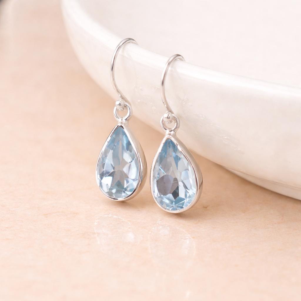 Perfect as sterling silver blue topaz earrings, December birthstone jewellery, bridal jewellery, anniversary gifts, or elegant everyday drop earrings, this design blends classic shape with luminous colour.