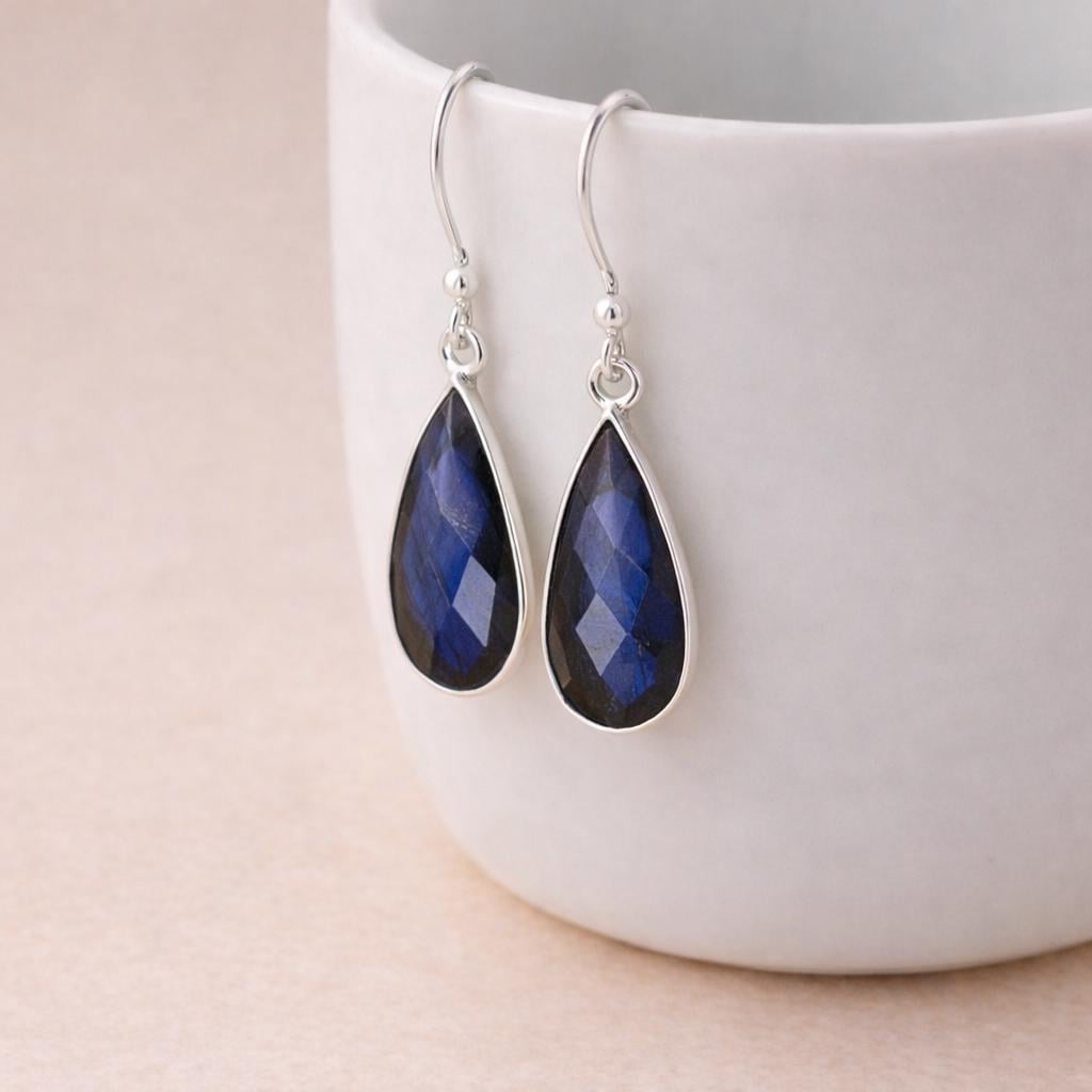 These Labradorite Teardrop Drop Earrings are crafted from solid 925 sterling silver and set with genuine labradorite gemstones, finished in deep smoky grey tones with flashes of electric blue fire. Elegant and full of movement, they offer a striking yet refined statement in a timeless teardrop silhouette.