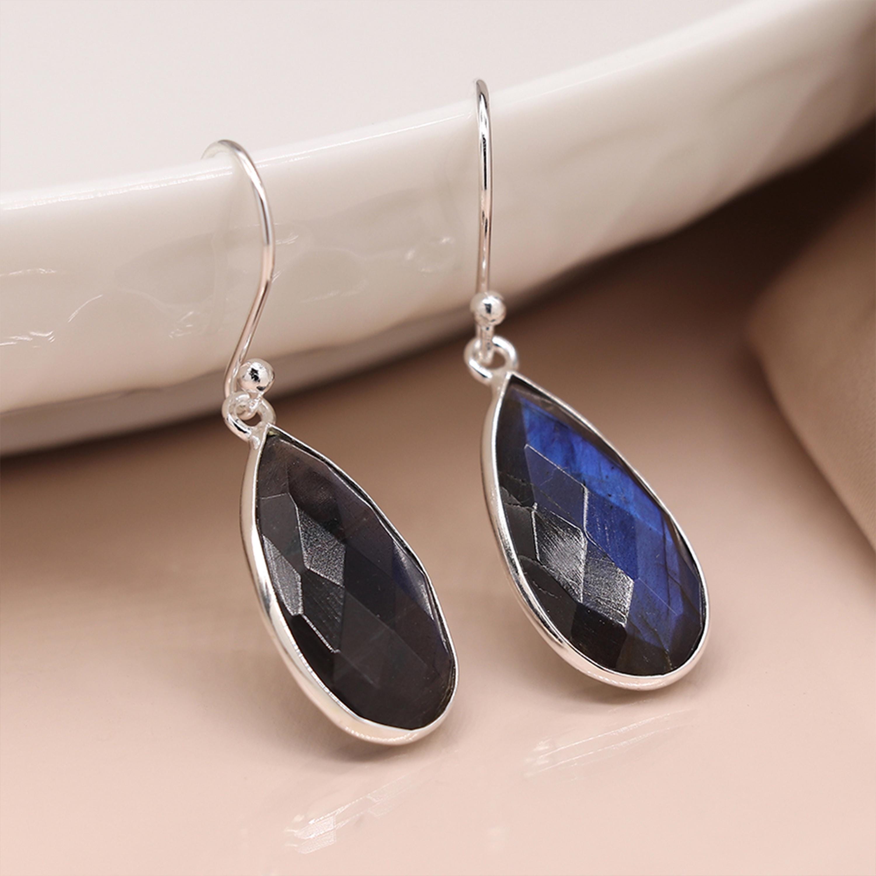 Each faceted stone measures approximately 20mm in height and 13mm in width, with a depth of 3mm, creating a beautifully elongated shape that flatters the neckline. The gemstones are bezel set in polished sterling silver, allowing the natural colour play of the labradorite to take centre stage. Suspended from classic silver hook fittings, they move gently as you wear them, catching the light and revealing flashes of colour from different angles.