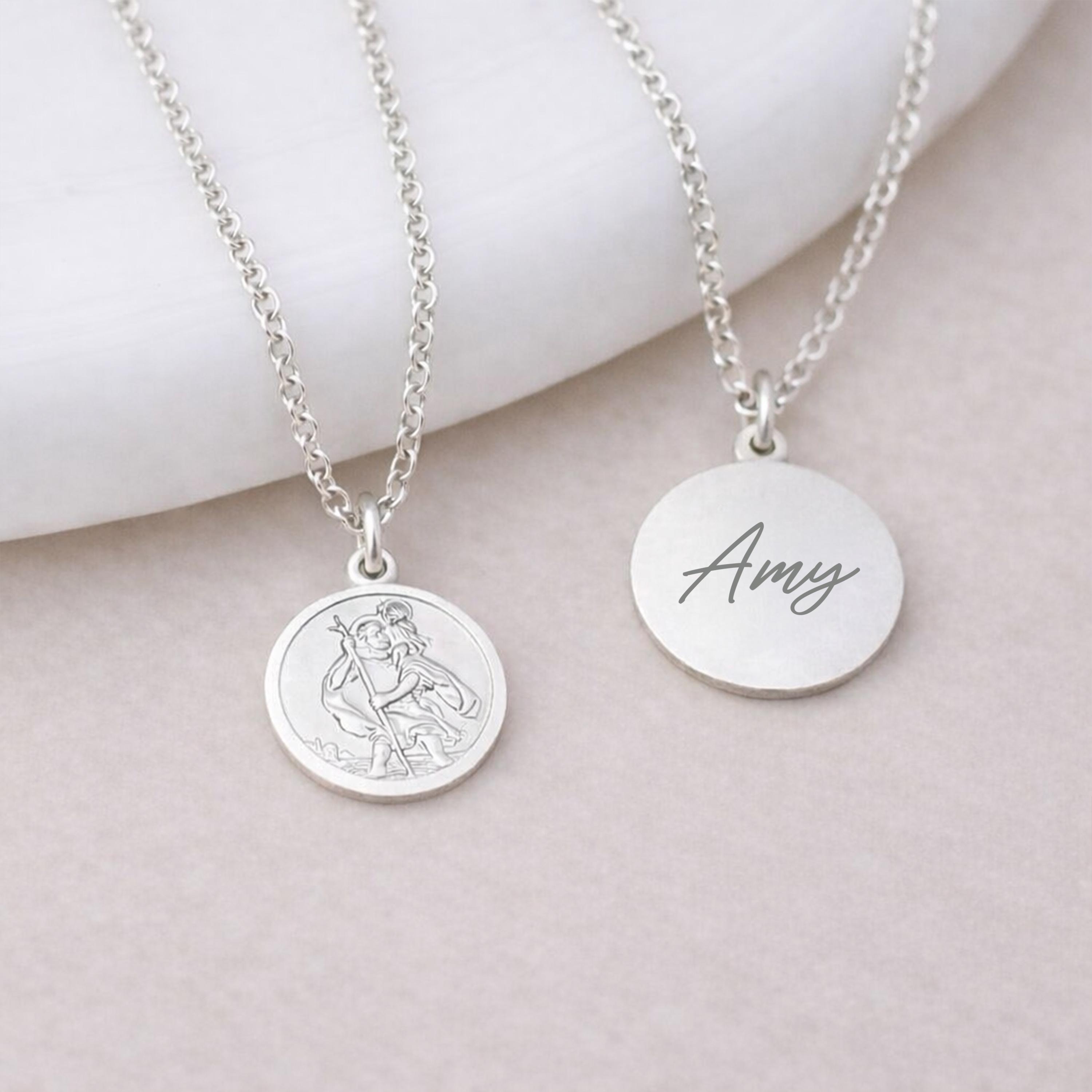 This St Christopher Disc Necklace is crafted from solid 925 sterling silver and finished in a bright, polished silver tone, featuring a beautifully detailed Saint Christopher motif on the front and an optional personalised engraving on the reverse. A timeless symbol of protection, it is designed to be worn daily as a meaningful keepsake.