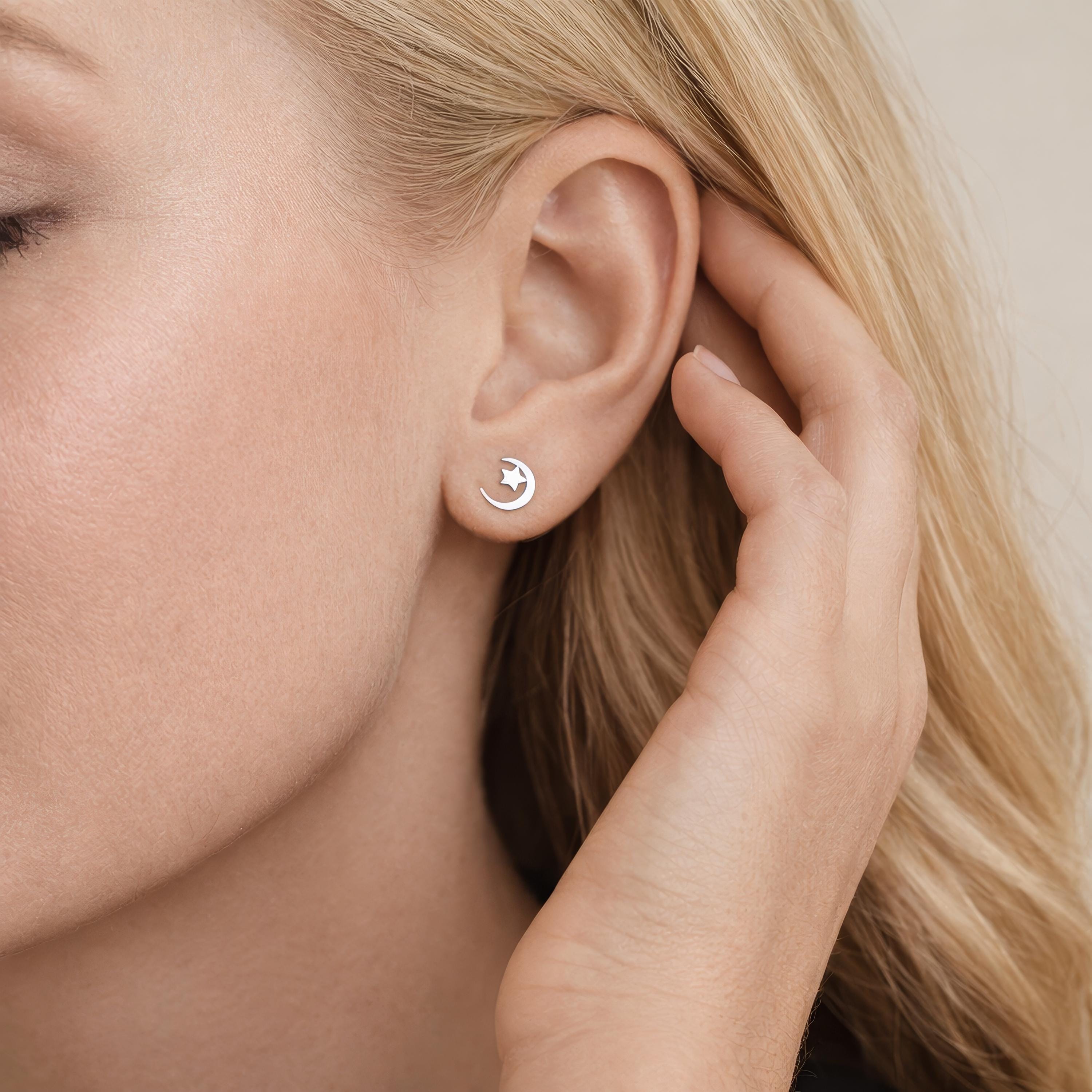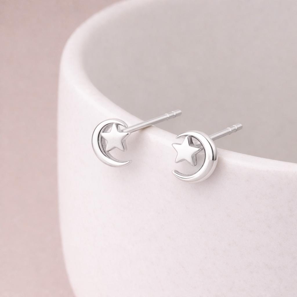 Each stud features a softly curved crescent moon embracing a tiny star at its centre, creating a beautifully balanced silhouette. The smooth high polish finish enhances the gentle curves of the moon while allowing the star detail to catch the light with a soft shimmer. At 6mm, they sit neatly on the lobe, making them perfect for everyday wear, second piercings, or a refined minimalist look.