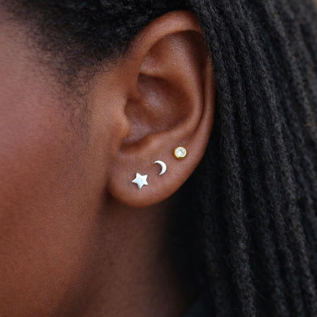 Each stud is smoothly polished to enhance the crisp points of the star and the gentle curve of the crescent moon. The high shine silver finish reflects the light beautifully while maintaining a clean, minimalist silhouette. At 5mm, they sit neatly on the lobe, making them perfect for first piercings, second holes, or a refined layered ear stack.