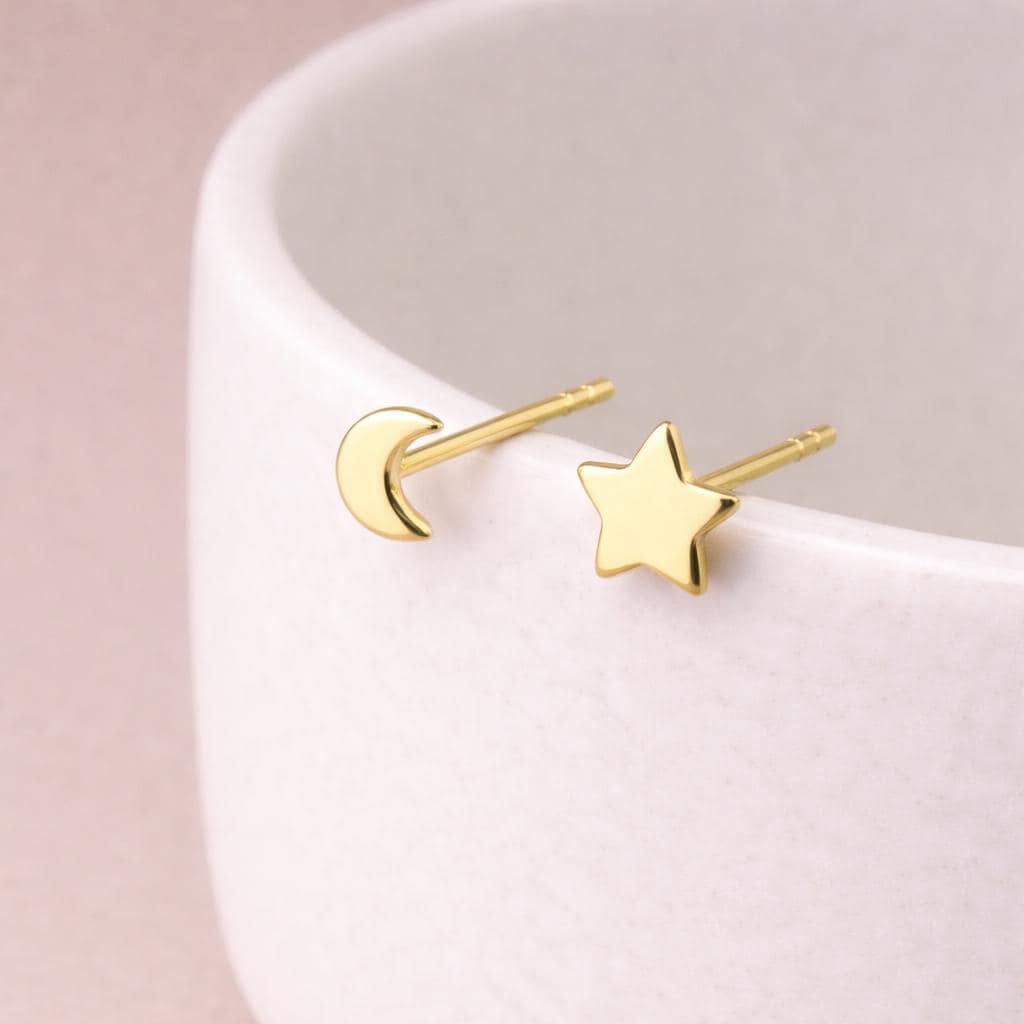 These Star and Moon Stud Earrings are crafted from solid 925 sterling silver with 18ct yellow gold plating and finished in a rich, polished golden tone. Measuring 5mm, this mismatched celestial pair features one classic star stud and one delicate crescent moon, creating a subtle yet playful everyday look.