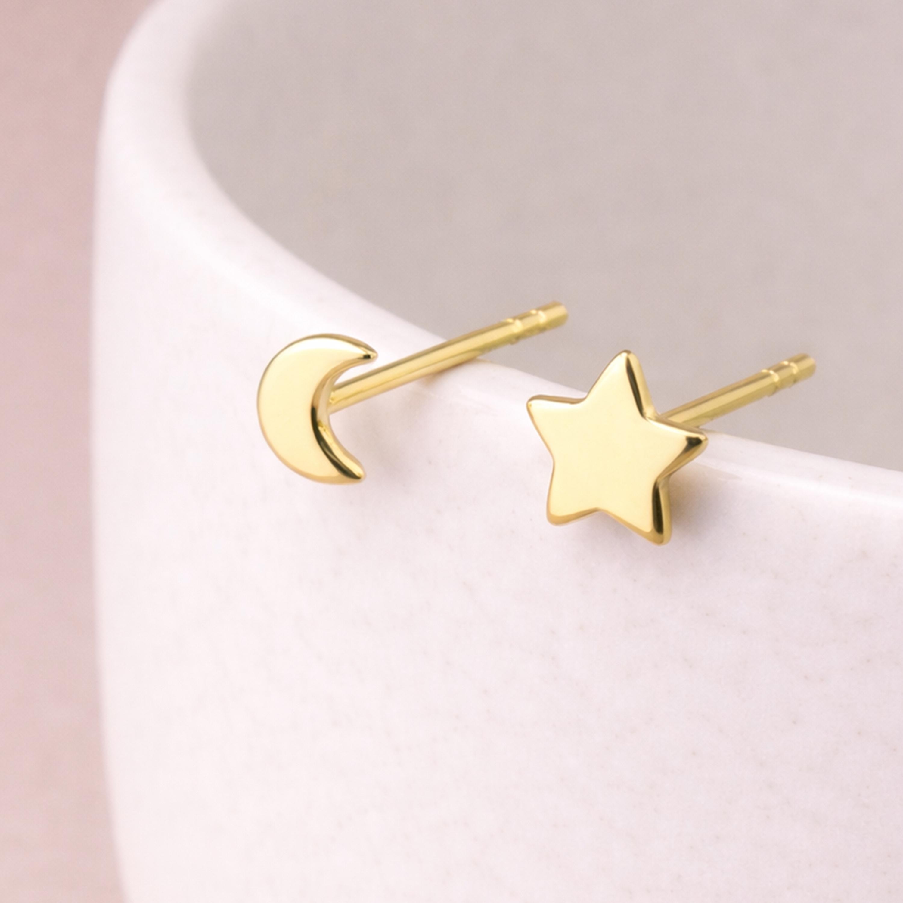 Each stud is smoothly polished to enhance the clean curves of the crescent and the crisp points of the star. The high shine gold plated finish reflects the light beautifully while maintaining a minimalist silhouette. At 5mm, they sit neatly on the lobe, making them ideal for first piercings, second holes, or a refined layered ear stack.