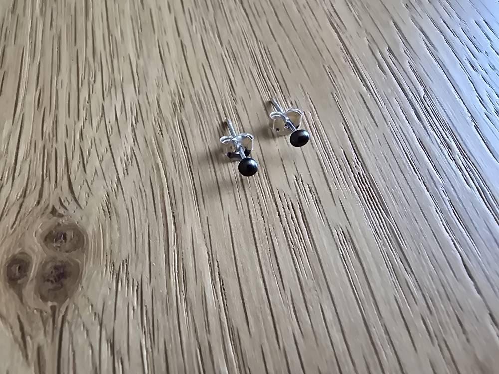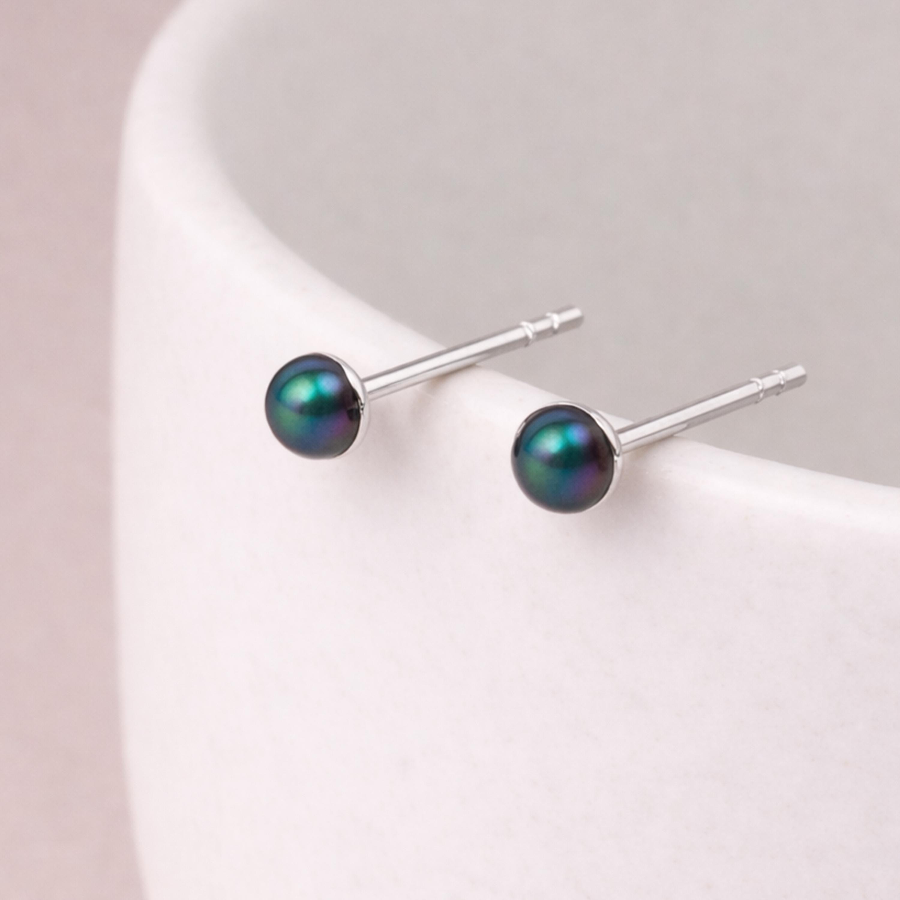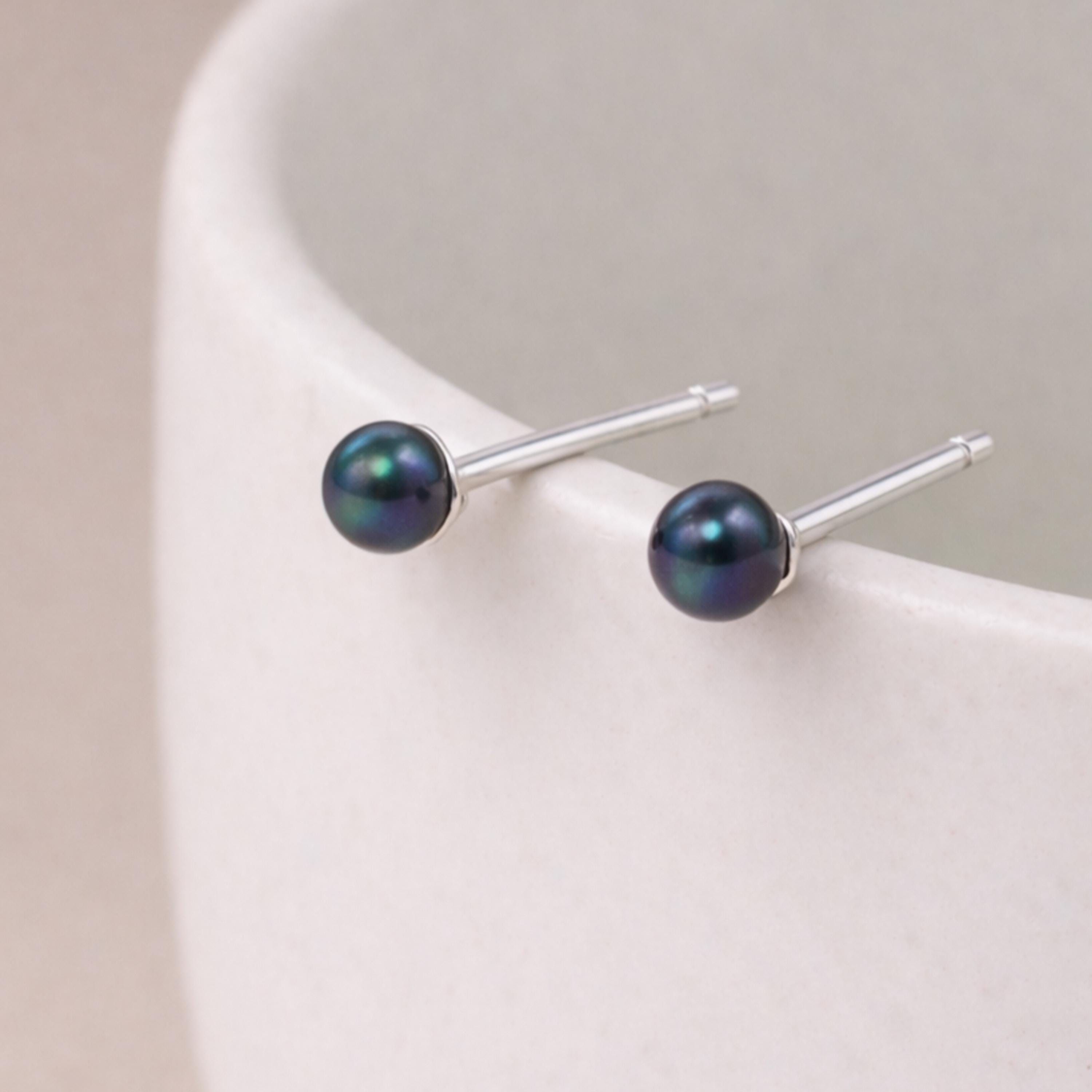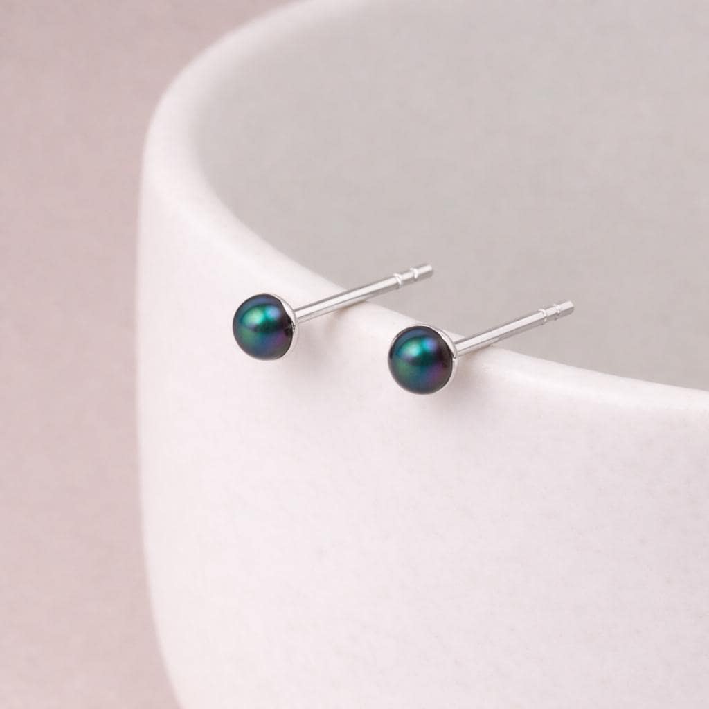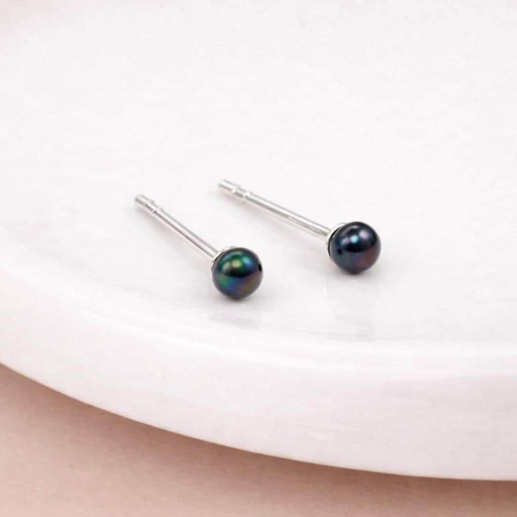 Each stud features a small 3mm freshwater pearl mounted on a polished sterling silver post. The pearls display beautiful natural lustre with deep tones that can range from charcoal and soft black to peacock shades of green, purple, and bronze depending on how the light catches the surface.
