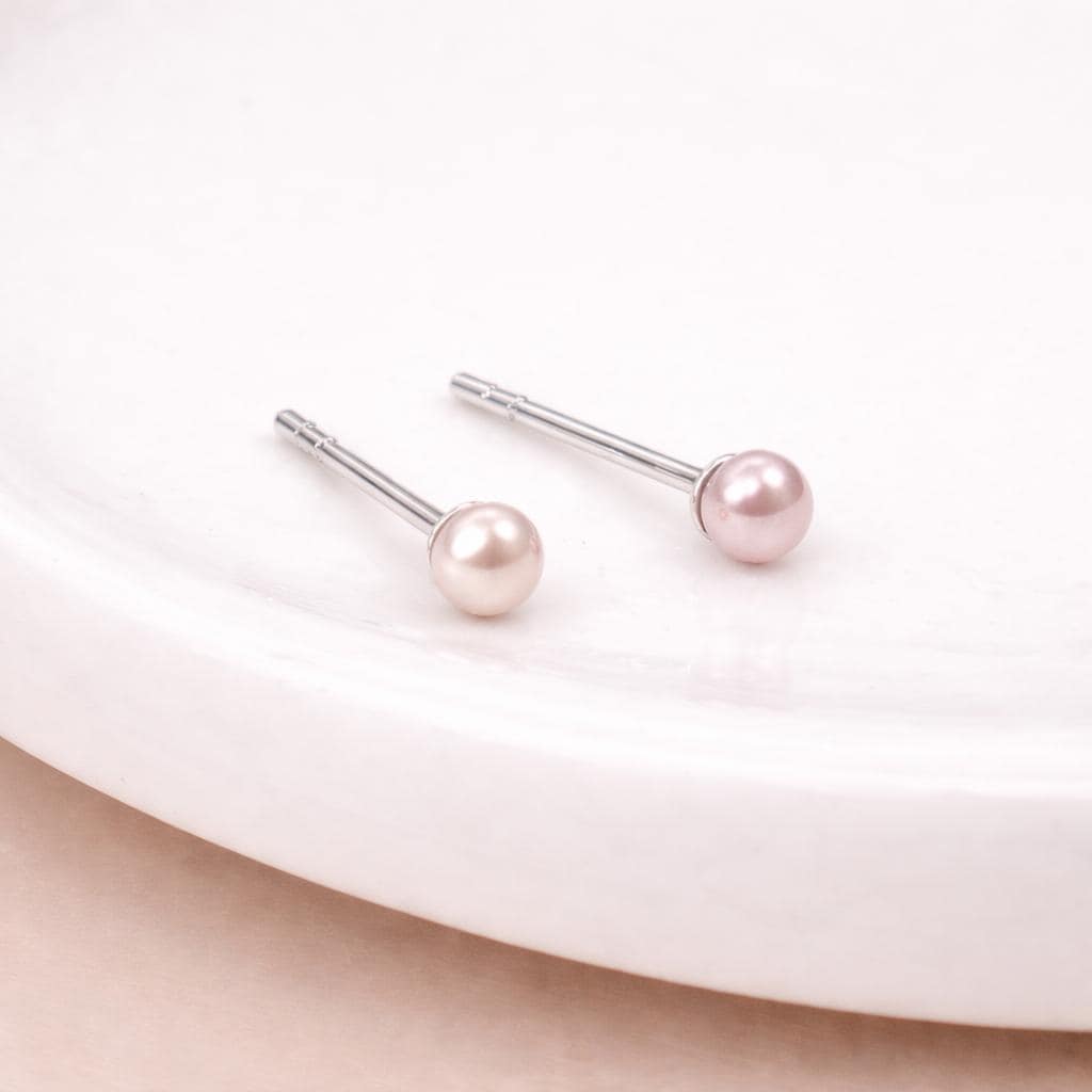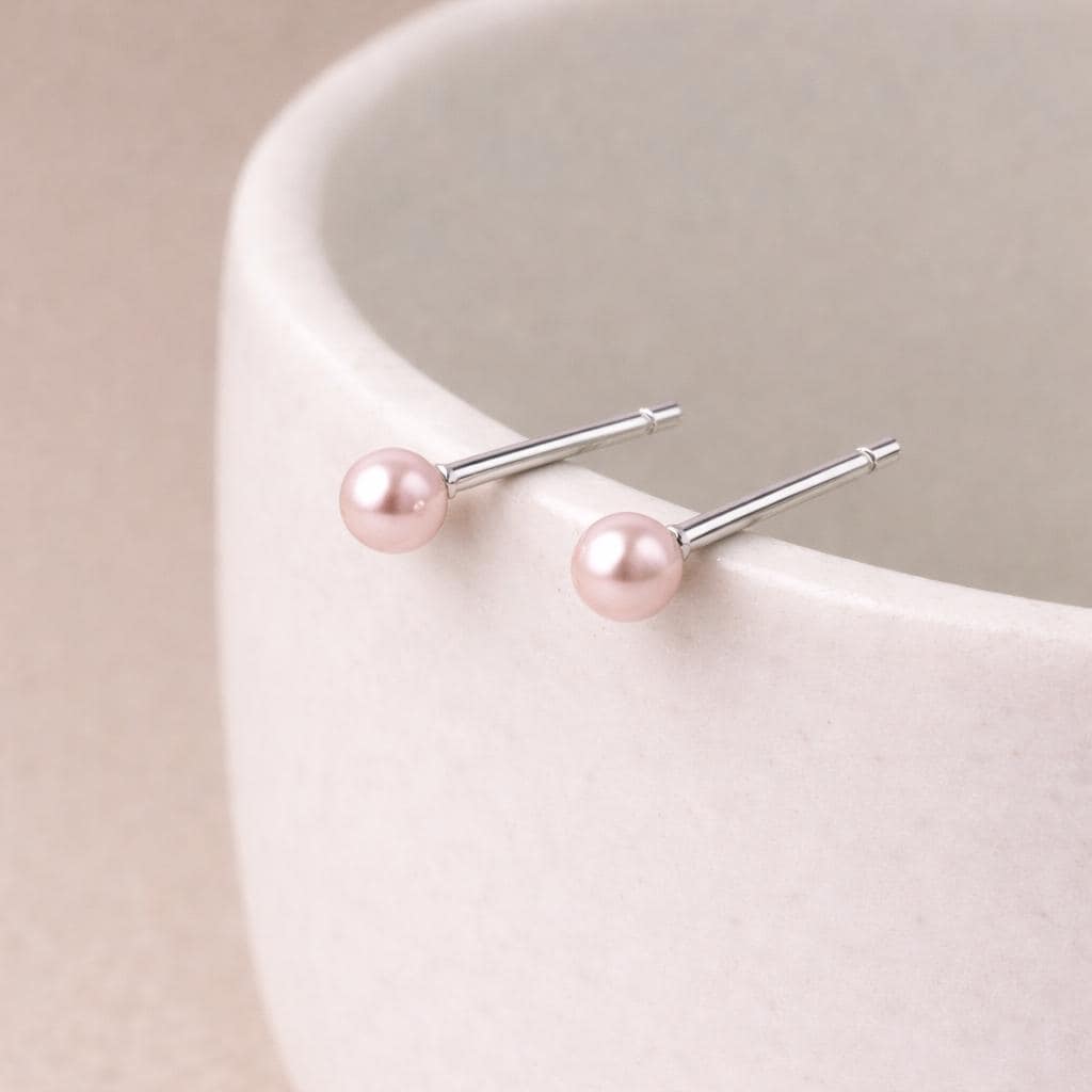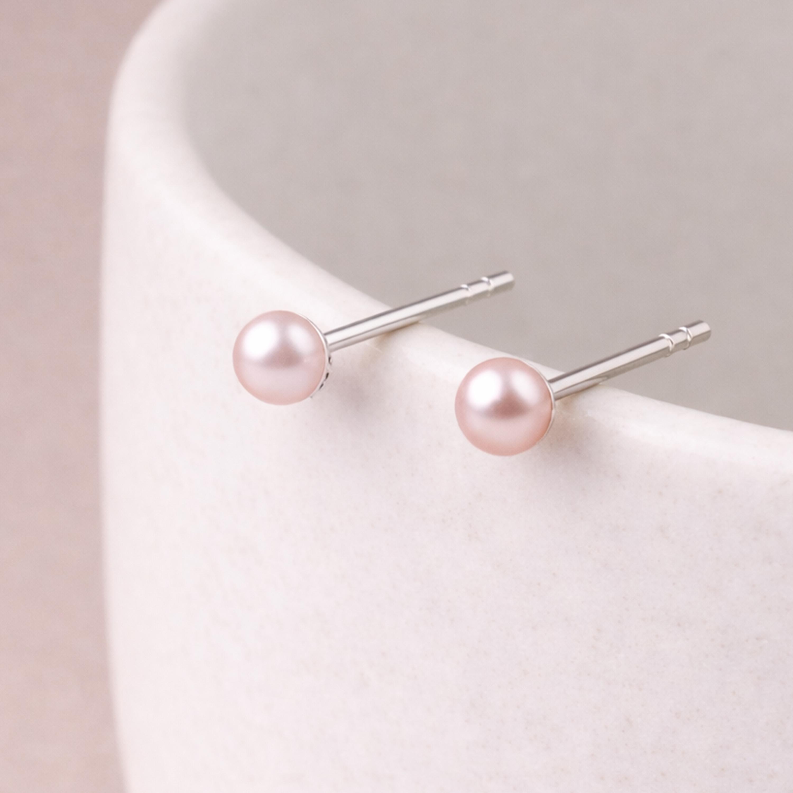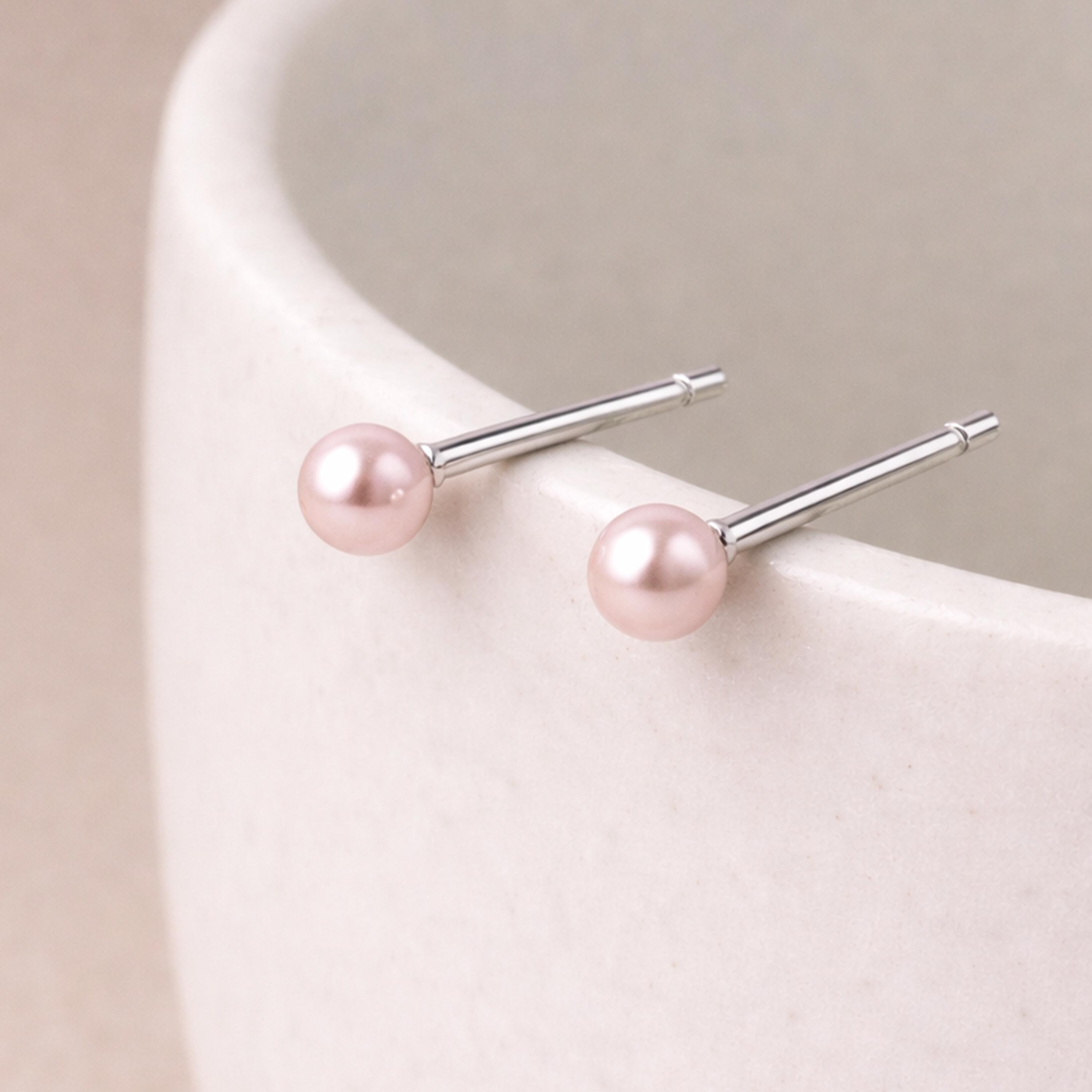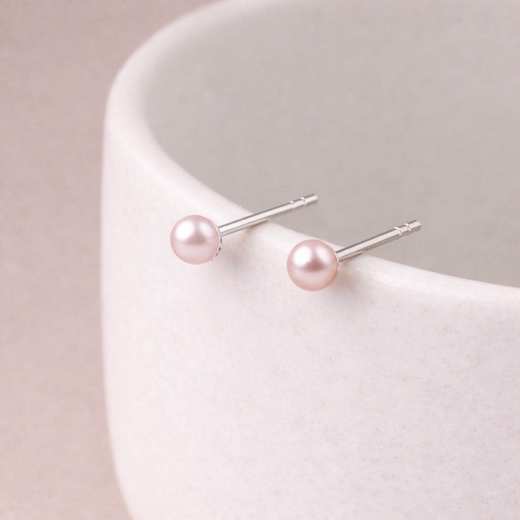 Each stud features a small 3mm freshwater pearl mounted on a polished sterling silver post. The pearls display gentle shades that can range from pale blush pink to soft rose tones depending on the light. Their natural lustre reflects soft highlights across the surface, giving the pearls a delicate glow.