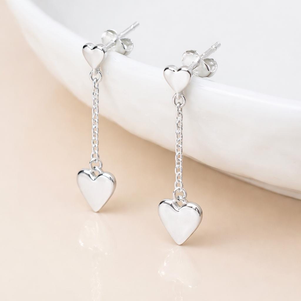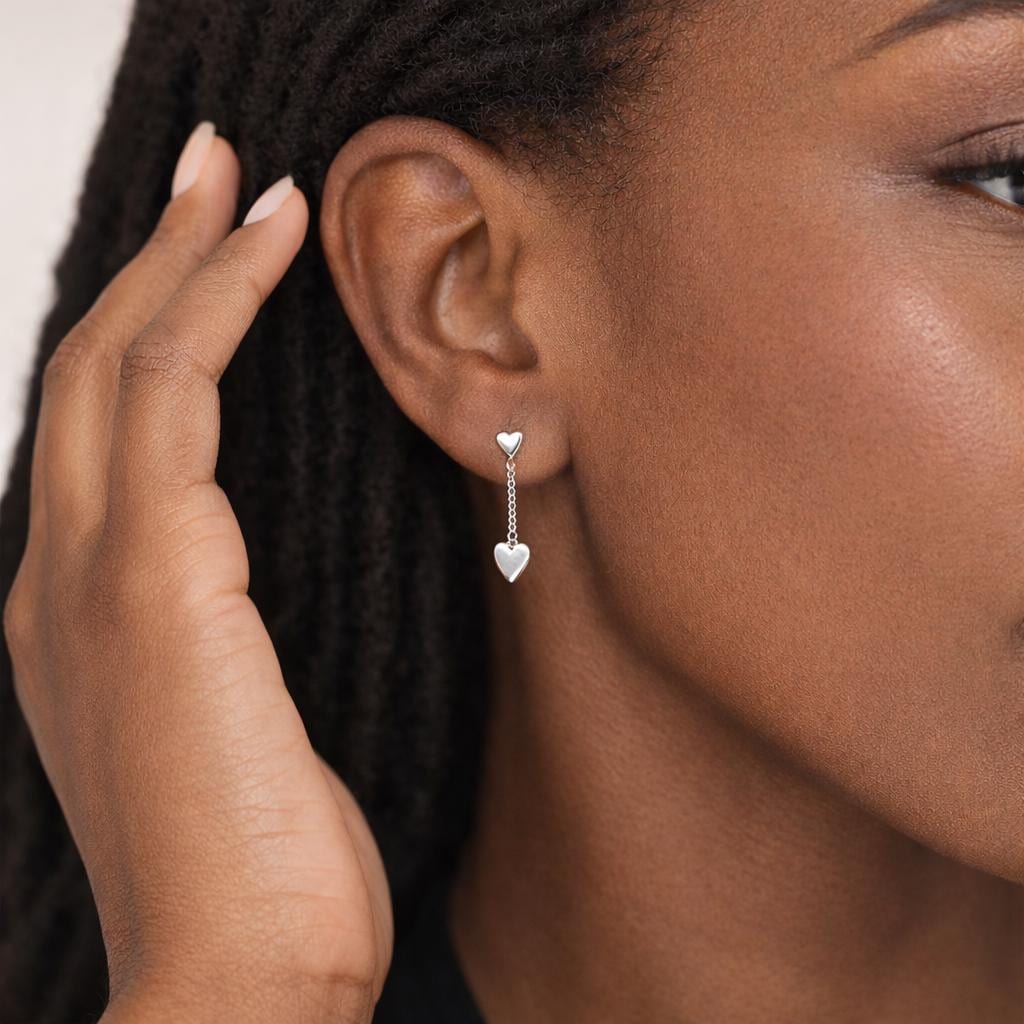 Each earring begins with a small polished heart stud at the lobe, from which a slender chain drops down to a second softly shaped heart charm. The clean, smooth finish of the hearts reflects light beautifully while the fine chain adds a graceful sense of movement as you wear them.