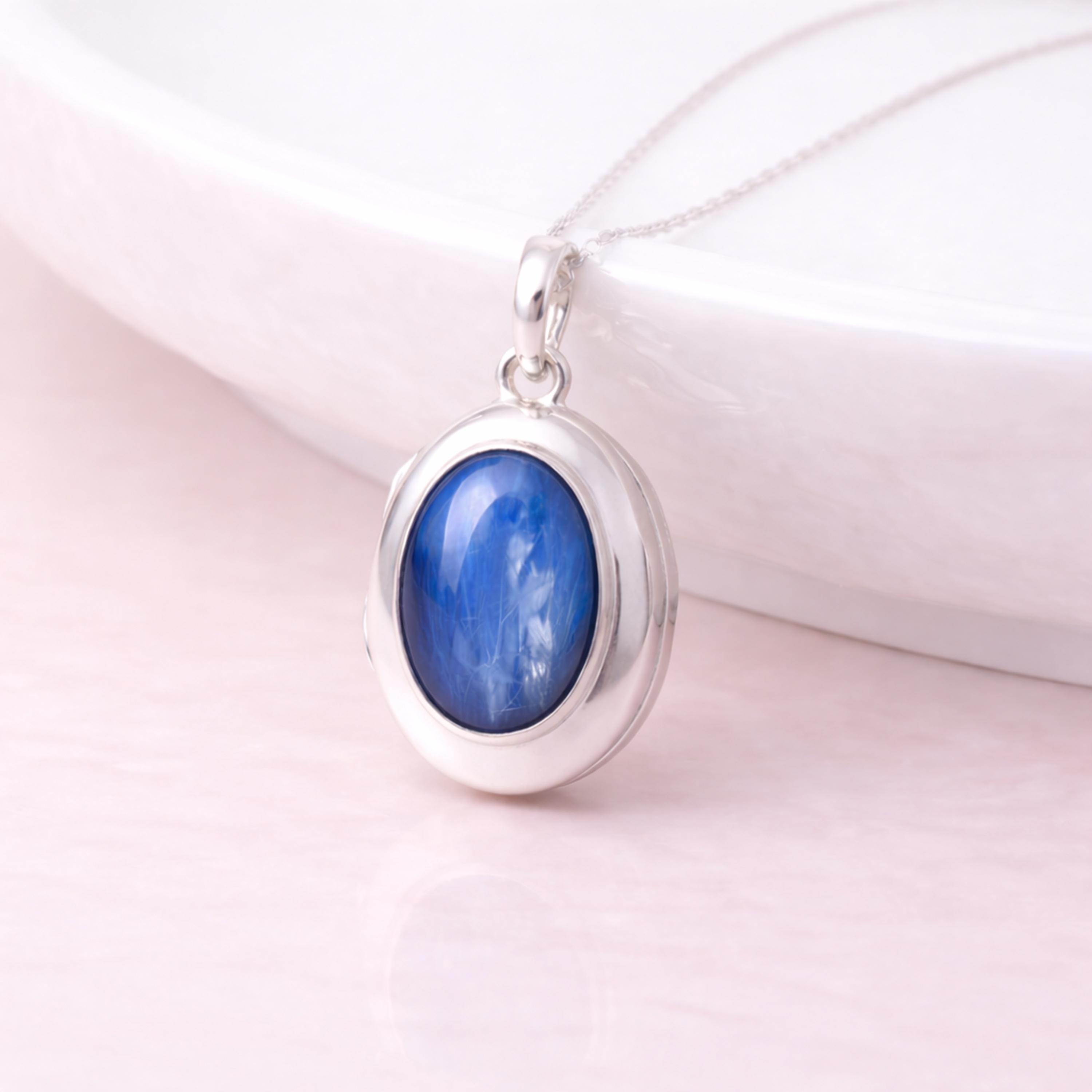 Perfect as a kyanite locket necklace, blue gemstone jewellery, or personalised keepsake gift, this design blends natural texture with timeless sentiment.