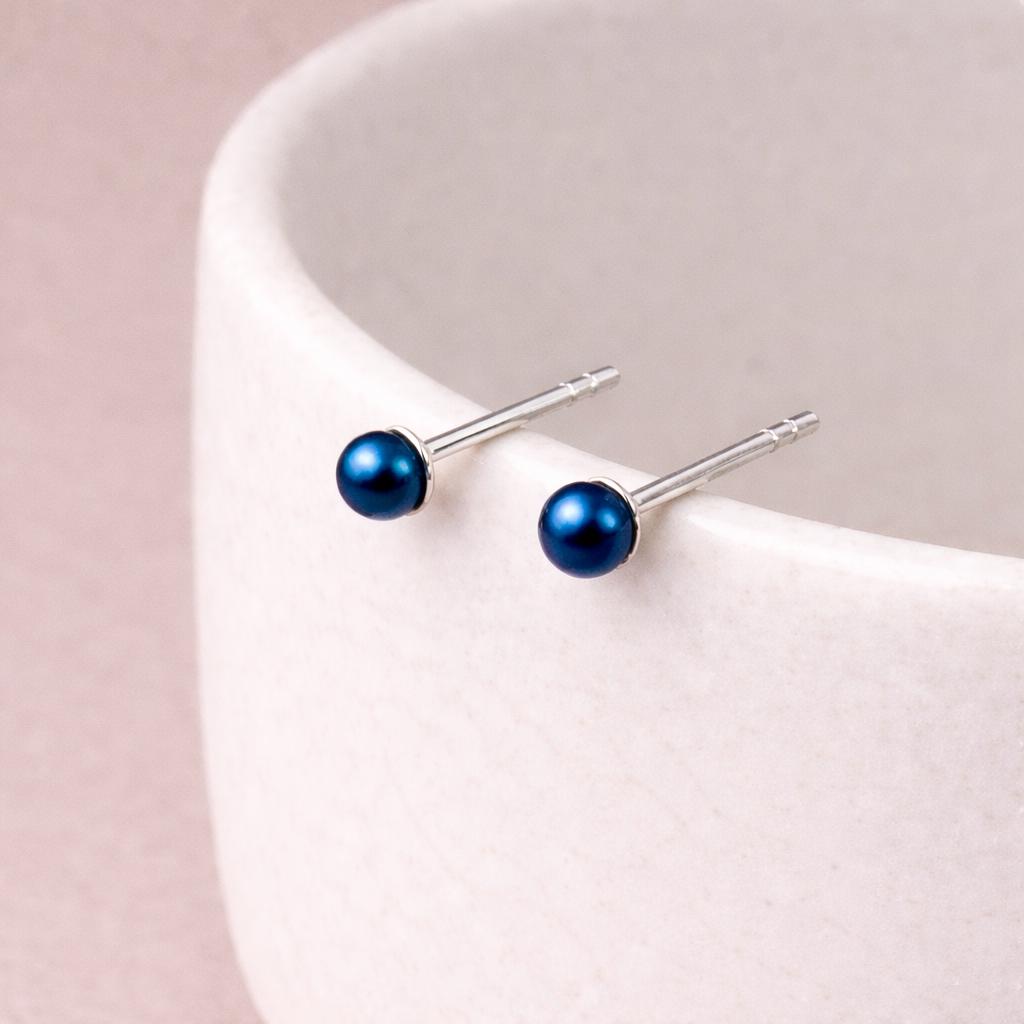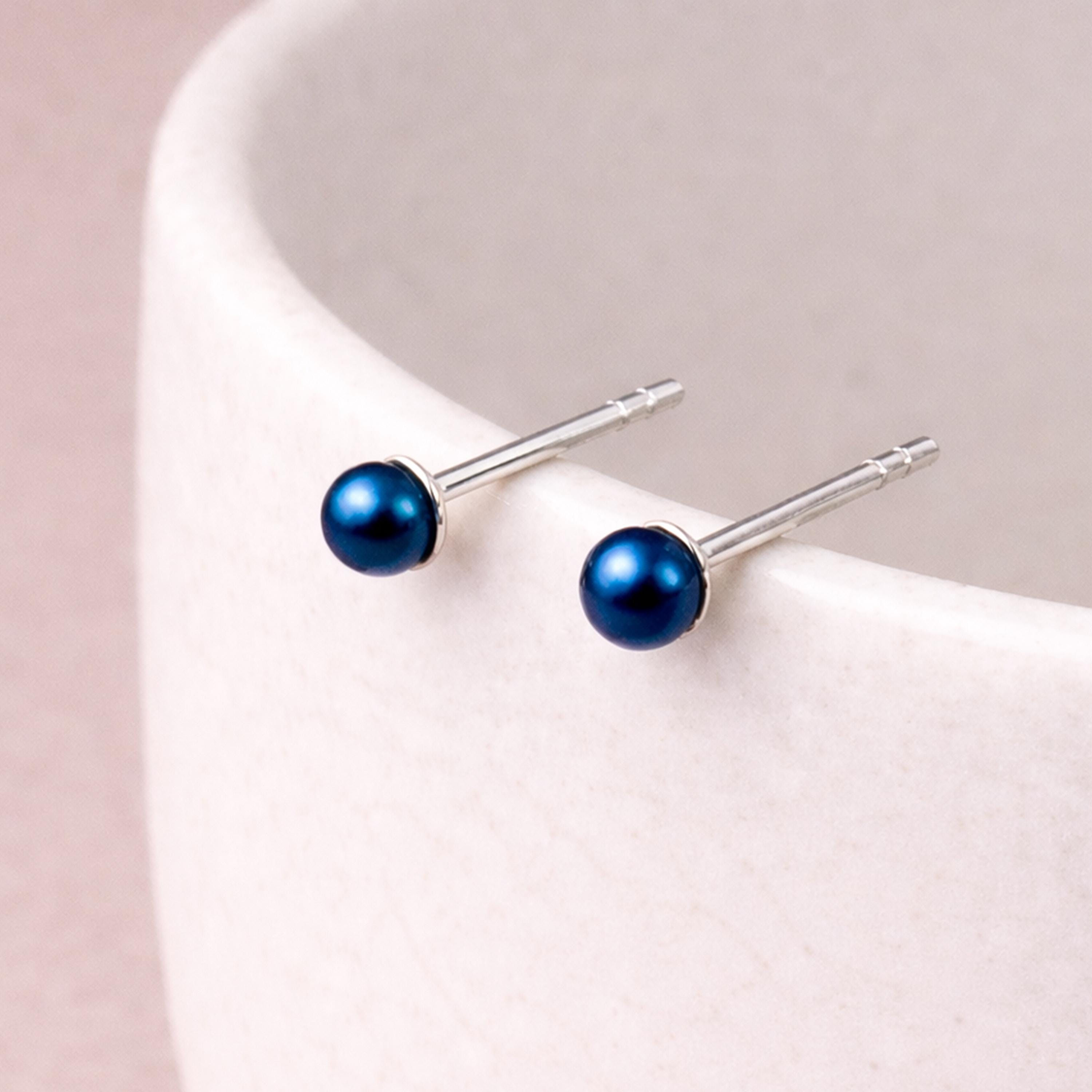 Each stud features a small 3mm freshwater pearl mounted on a polished sterling silver post. The pearls display beautiful natural lustre with deep tones depending on how the light catches the surface.