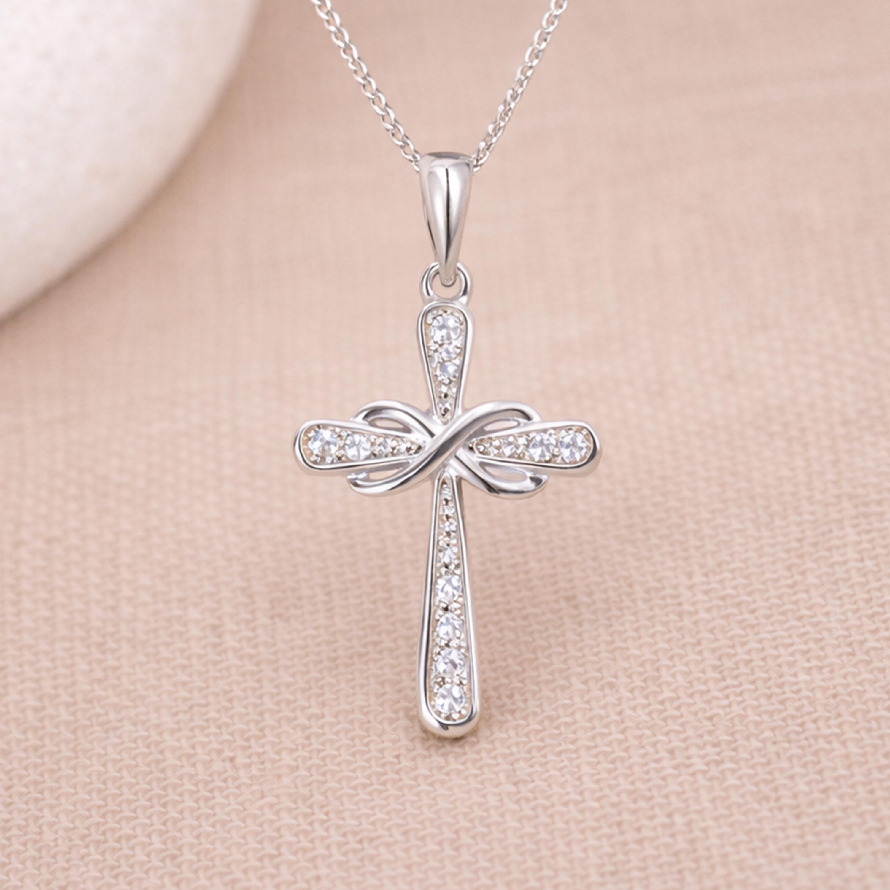 ♡ Style Tip: This infinity cross pendant looks especially elegant worn with a fine neckline or V neck top, allowing the length of the cross to sit neatly and catch the light.