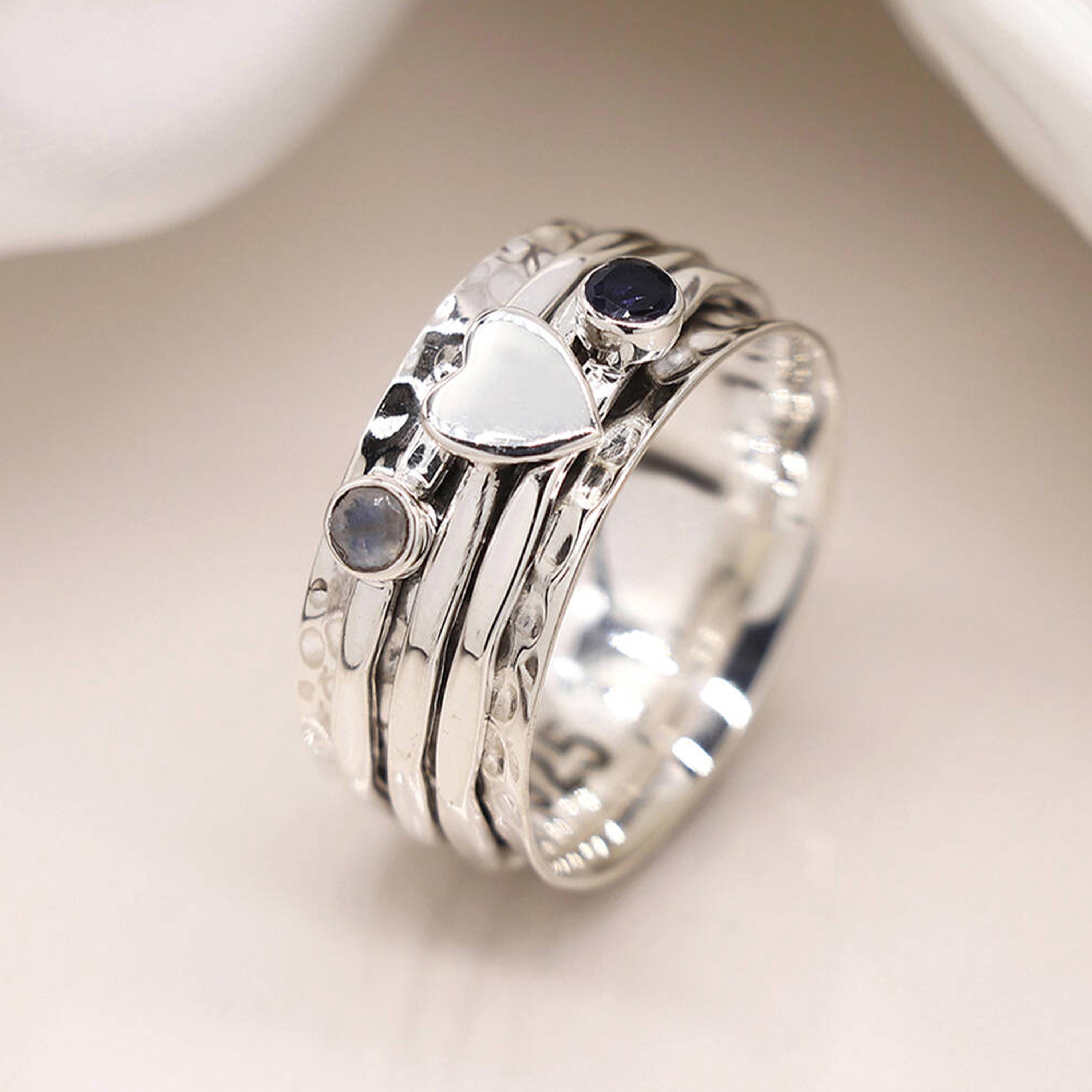 Made by hand from solid 925 sterling silver, this wide 10mm ring is built with layered spinning bands that move smoothly around the finger. A polished silver heart sits at the centre of the design, symbolising love and connection, while two gemstones add gentle colour and depth. One band holds a 3mm iolite, known as the September birthstone, and another holds a 3mm rainbow moonstone, the birthstone for June. Together they create a beautiful balance of meaning, texture, and calm movement.