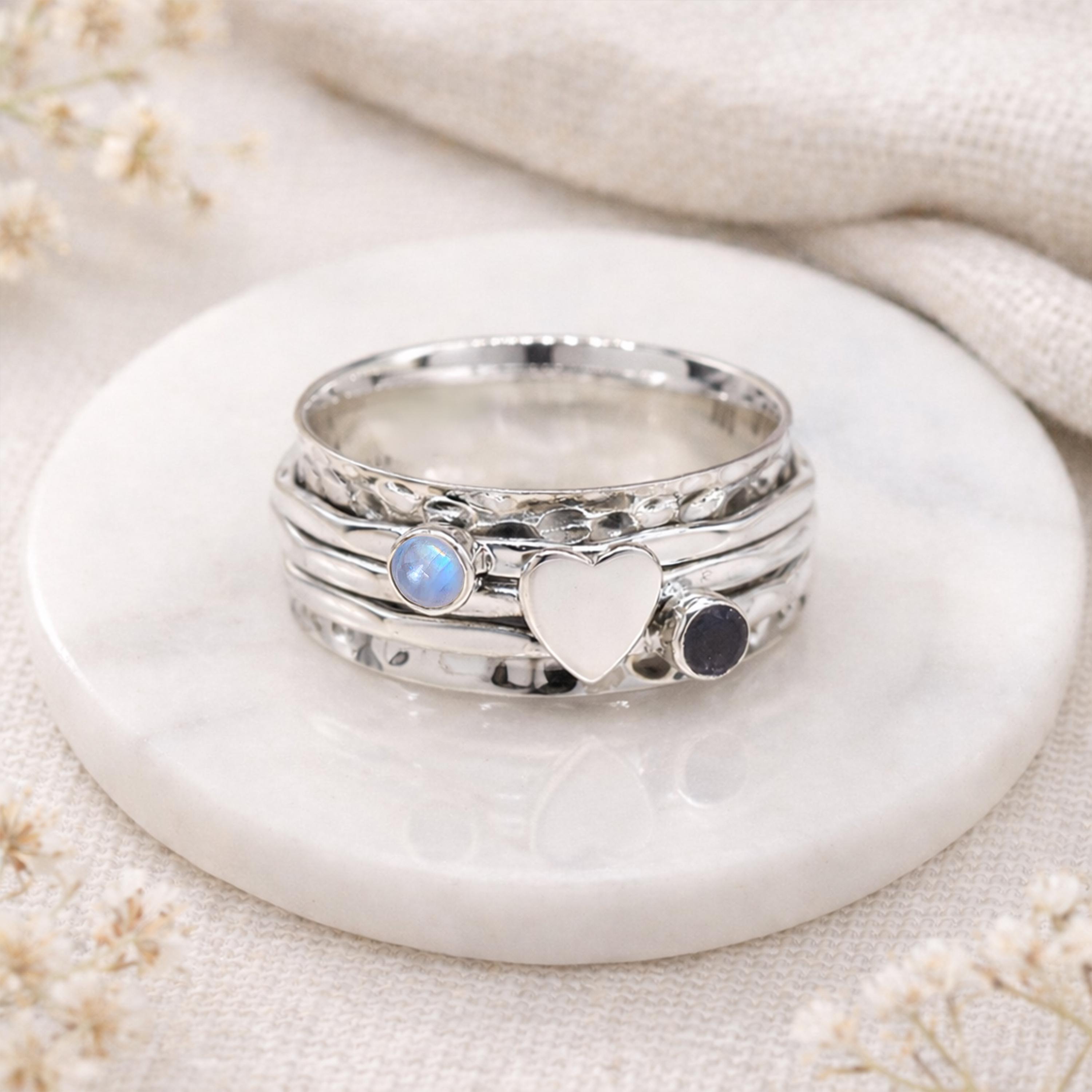 This handcrafted sterling silver spinner ring features a smooth silver heart surrounded by rotating bands set with iolite and rainbow moonstone, creating a meaningful statement ring full of movement and sentiment.