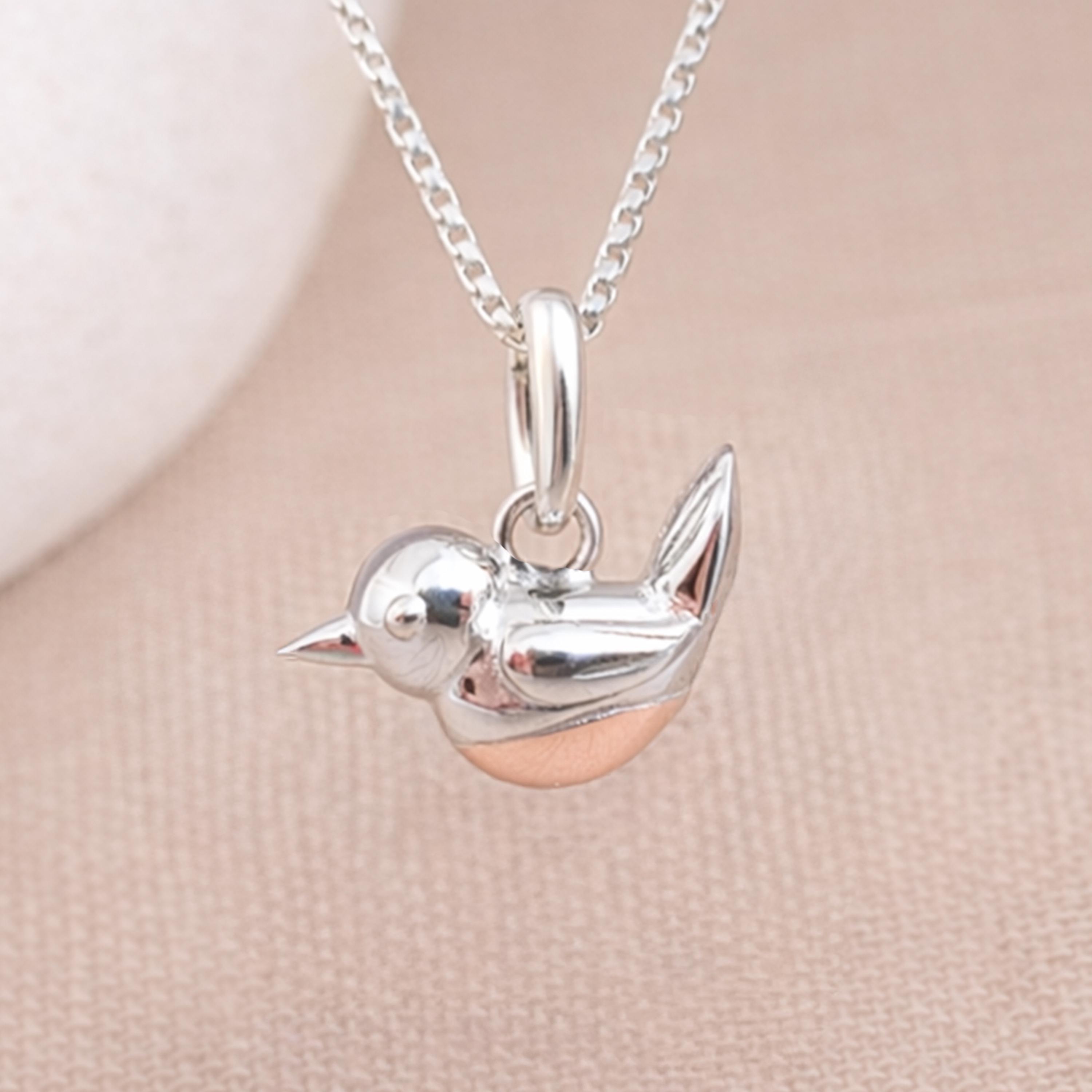 This Sterling Silver and Rose Gold Robin Red Breast Necklace is beautifully crafted from solid 925 sterling silver, finished with an 18ct rose gold plated breast that adds a soft, warm contrast to the polished silver bird.