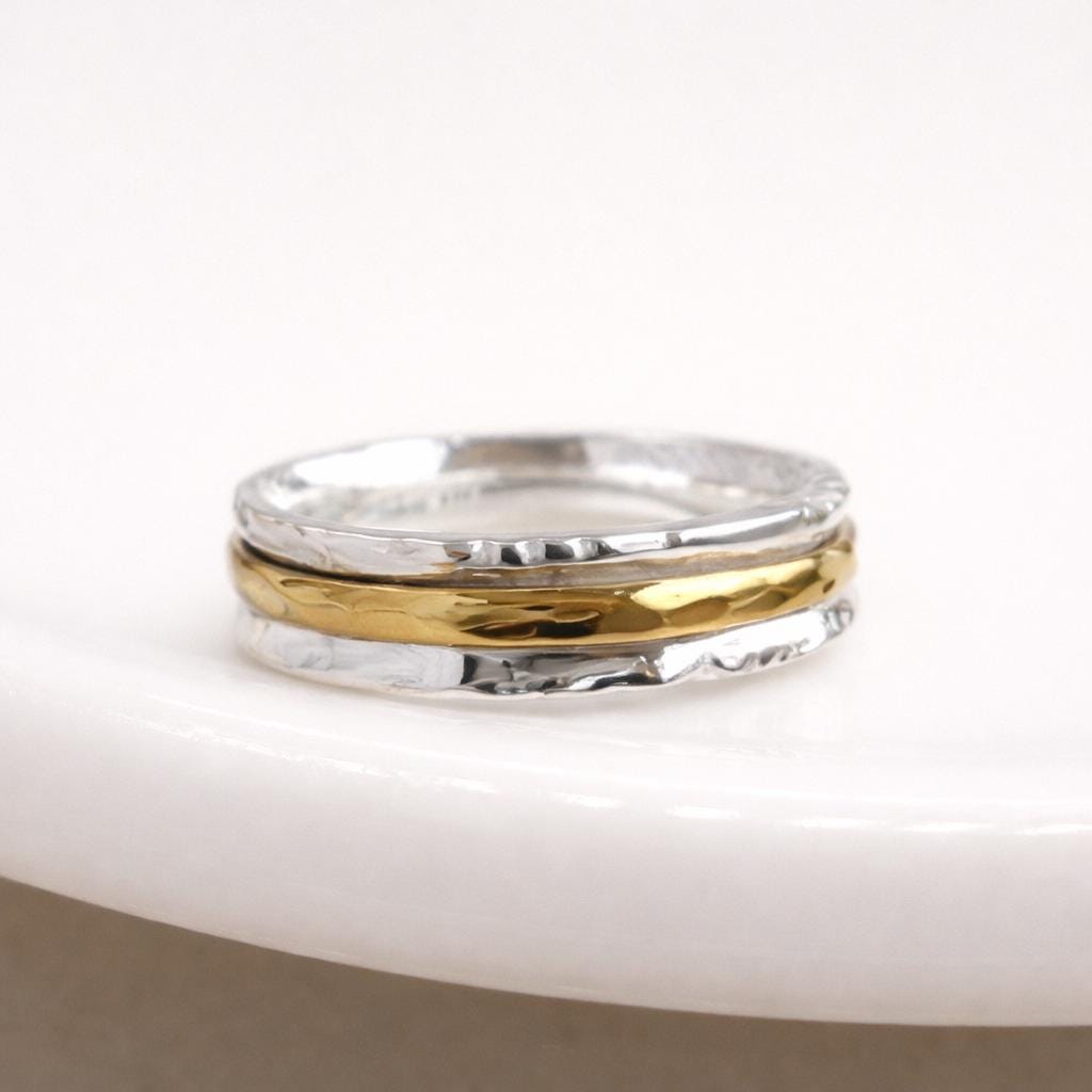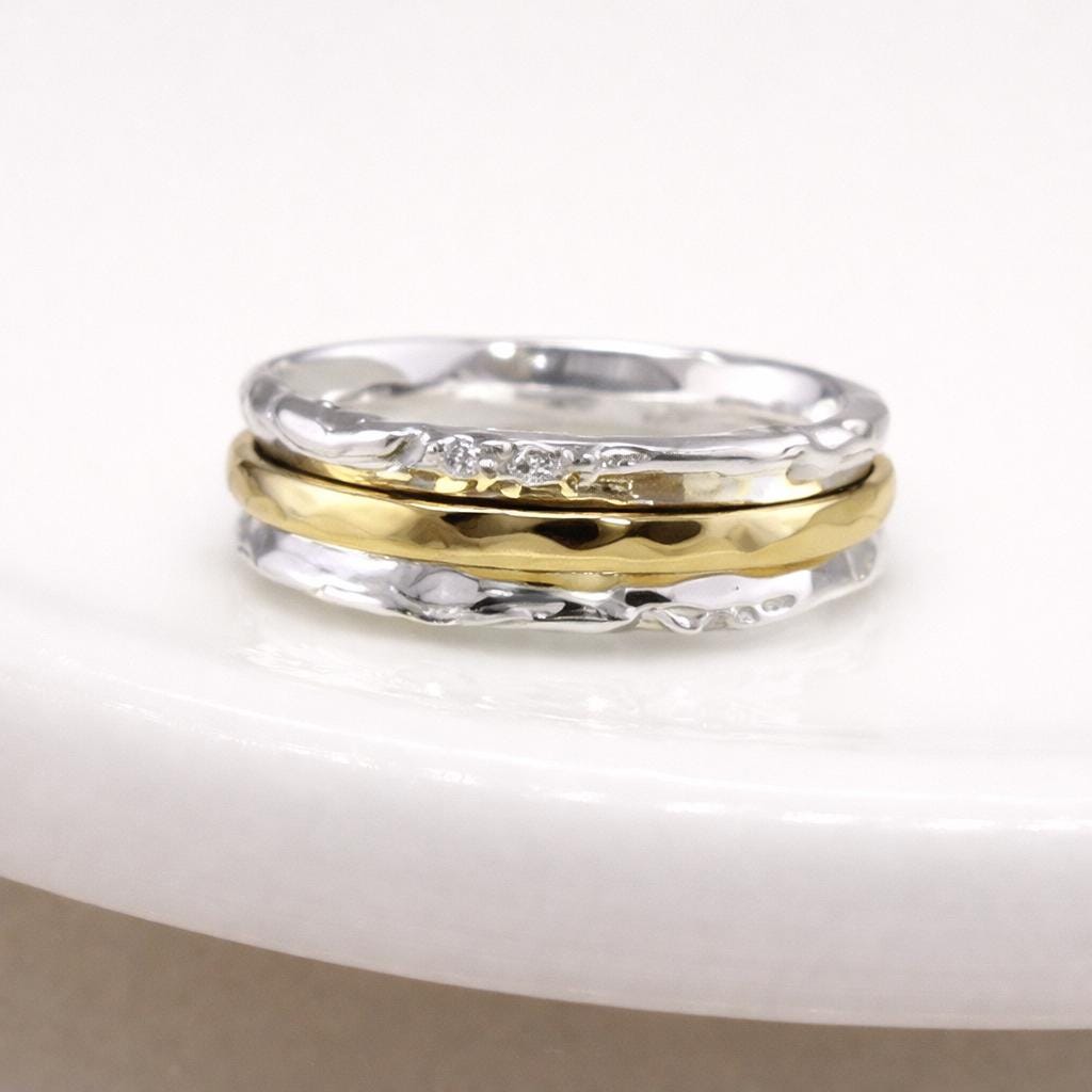 Not to be found anywhere on the high street, this beautiful ring is crafted from the finest sterling silver. Featuring a moving brass band that has been wrapped around the sterling silver base to form the spinning element of the ring, this spinner ring is available in a range of standard ring sizes.