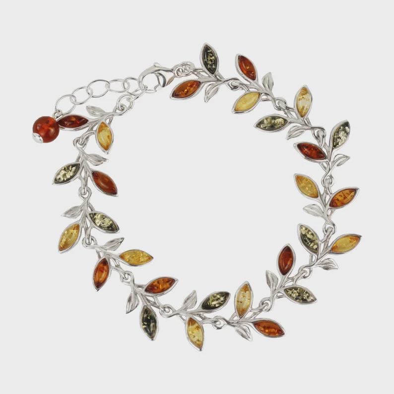 The bracelet features a delicate vine of leaf shaped amber stones, each one individually set to create a natural, organic movement across the wrist. The mix of warm honey, golden yellow, cognac, and deep green amber tones gives the piece depth and character, while the polished silver framework keeps the overall look elegant and balanced.
