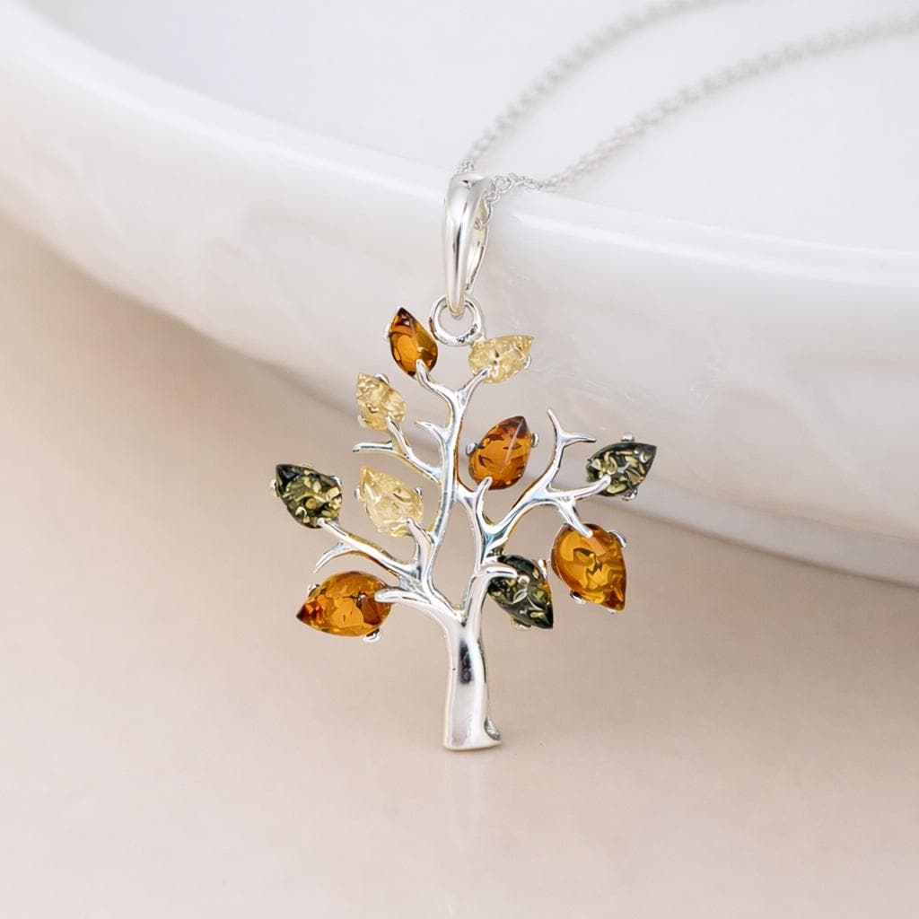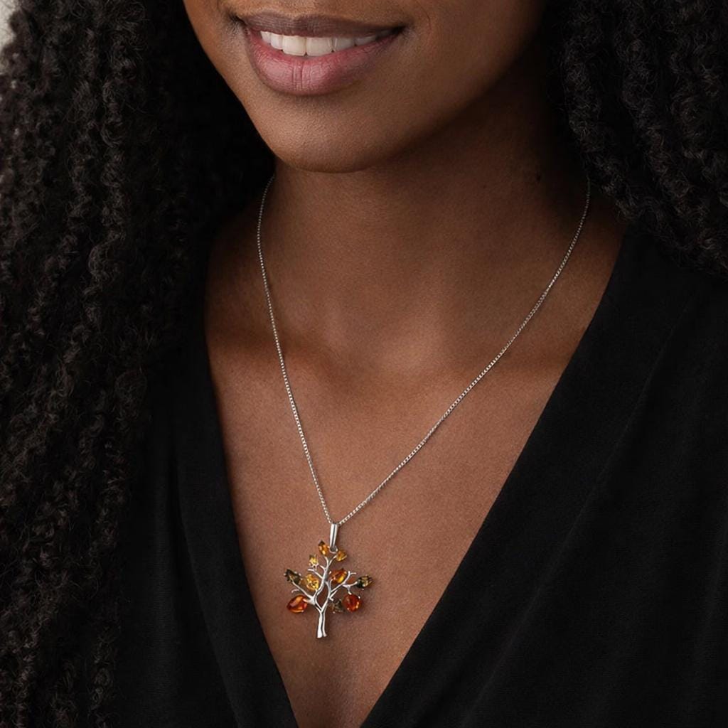 This Tree of Life pendant necklace is crafted from solid 925 sterling silver and set with genuine Baltic amber gemstones in rich autumnal tones. Designed in a classic tree silhouette, it symbolises growth, strength, and connection while offering beautiful natural colour and detail.