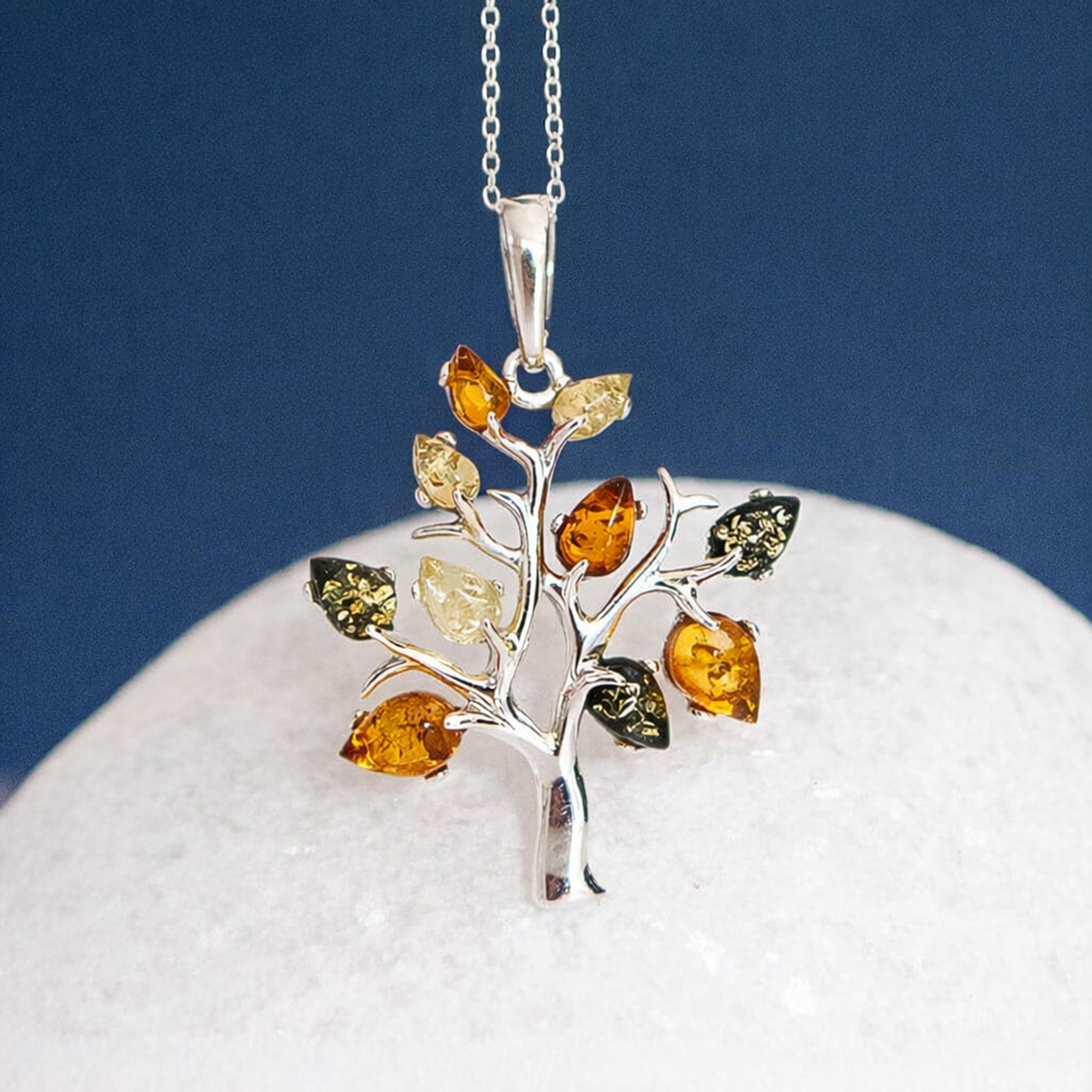 This sterling silver Tree of Life necklace is handcrafted from solid 925 sterling silver and set with genuine multicoloured Baltic amber, creating a meaningful statement pendant inspired by growth, connection, and nature.
