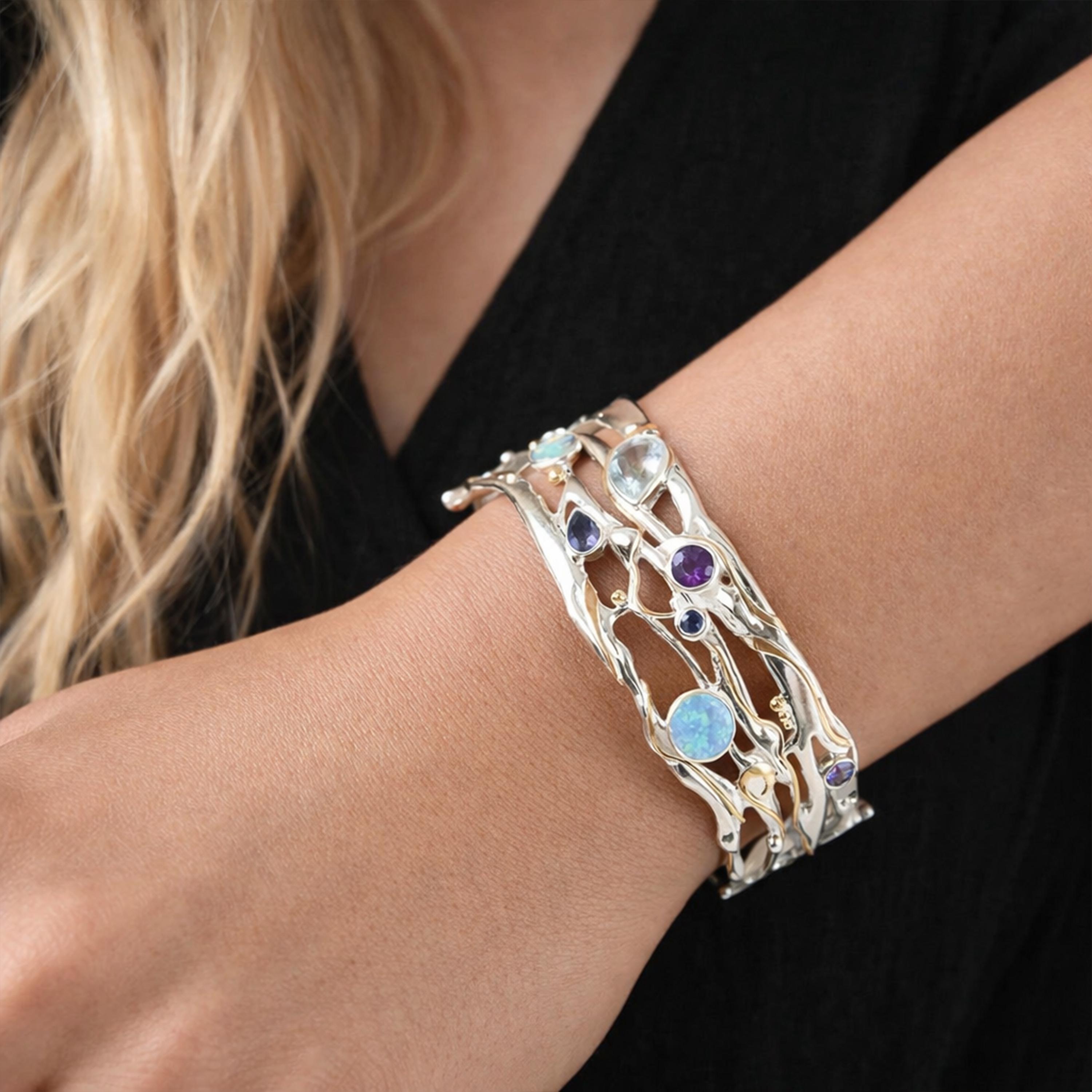 The wide bangle features an organic, layered silver design with softly undulating forms that wrap around the wrist. Interwoven through the silver are delicate lines of yellow gold, adding warmth and contrast. Set throughout the front are a carefully balanced selection of gemstones, each chosen to bring depth and visual harmony to the design.