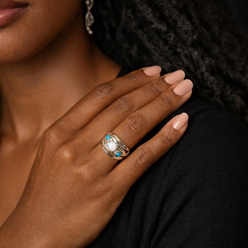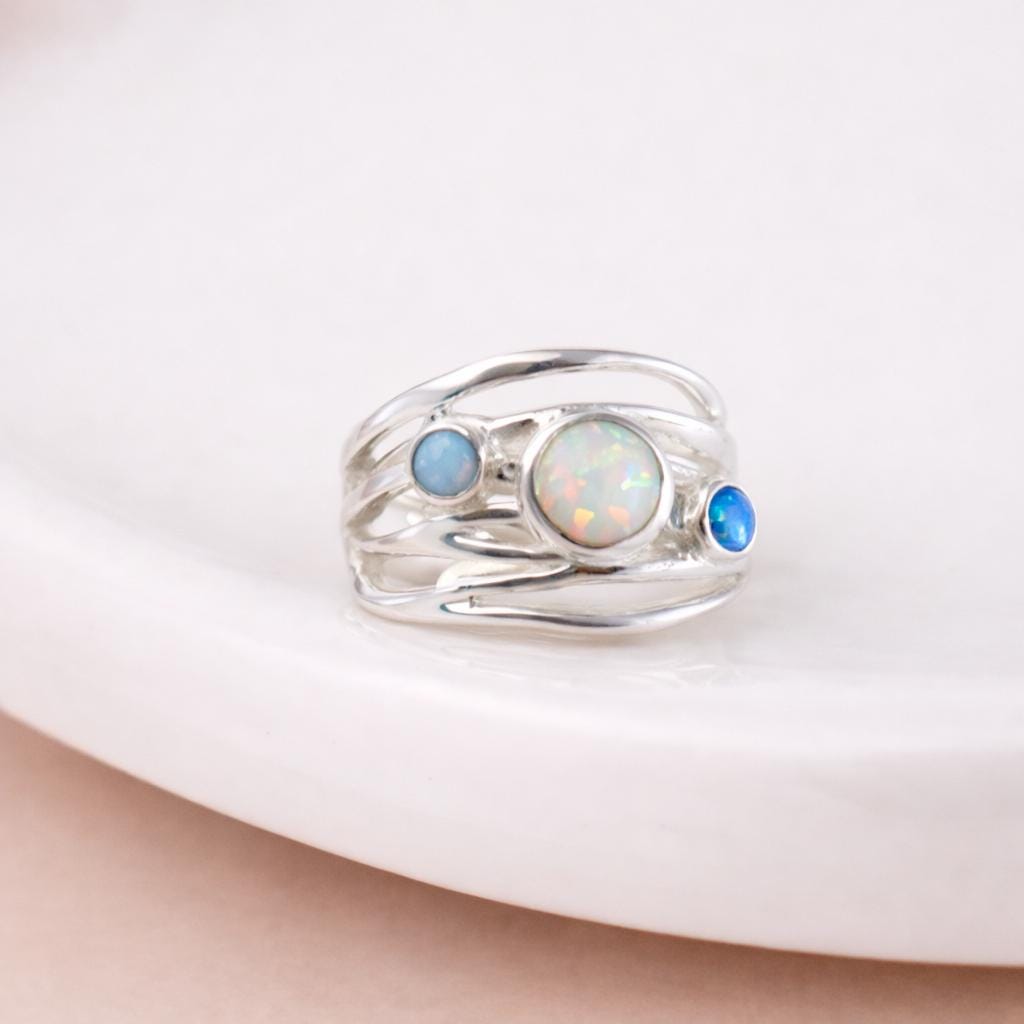 A luminous trio set in flowing silver — this bold, sculptural ring features a central white opal framed by two pale blue opals, all nestled in an organic molten-style sterling silver band. With its wide, fluid silhouette and soft curves, this piece evokes the feeling of natural movement and elemental energy.