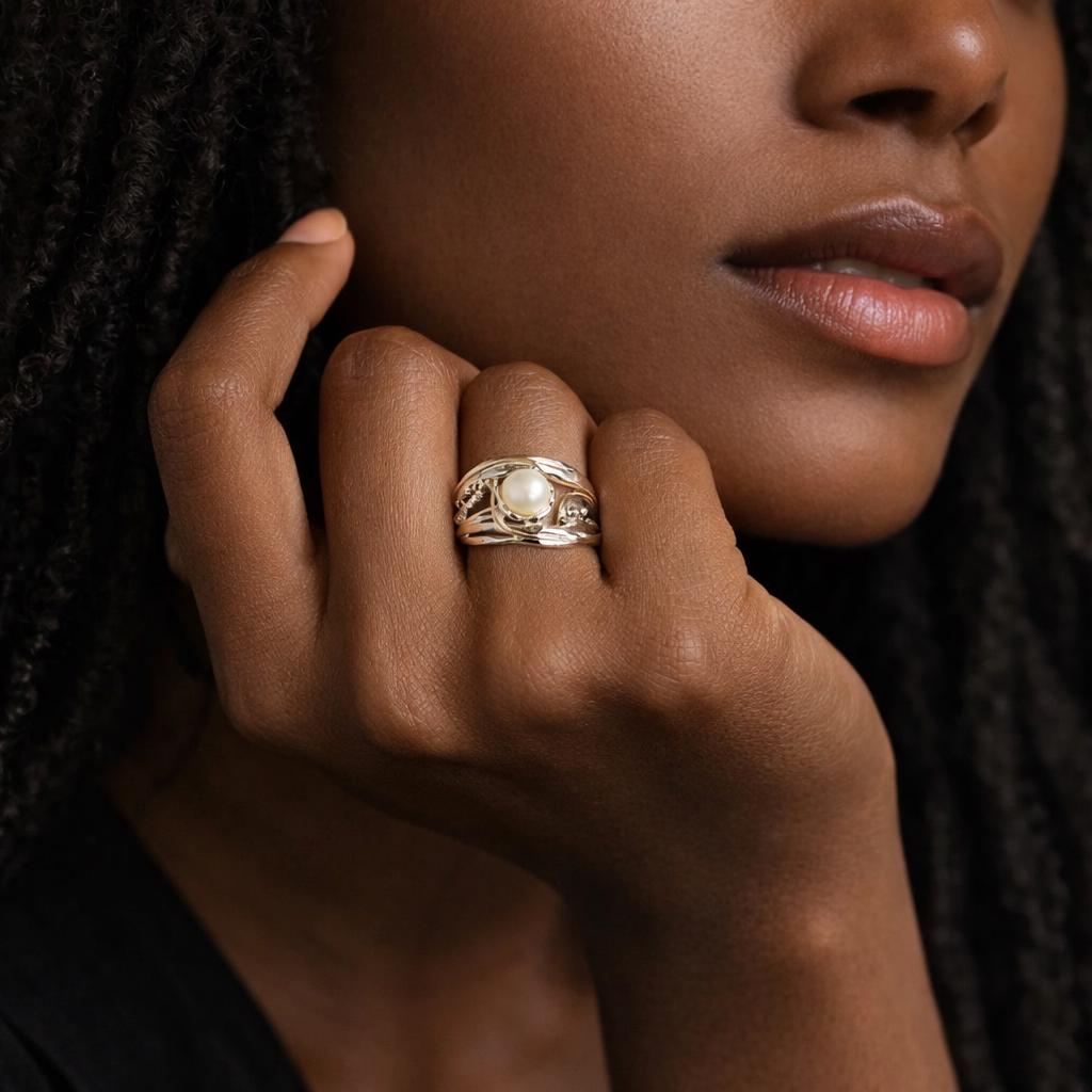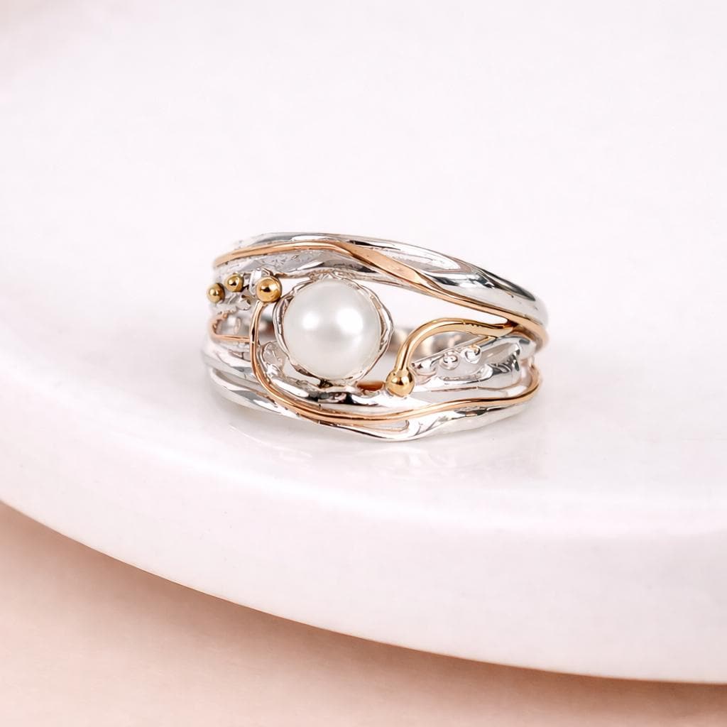 Luminous and sculptural, this organic-style ring features a glowing white freshwater pearl cradled in molten sterling silver, accented with flowing lines of 14kt gold fill wire and dotted with tiny brass pips. The layered design mimics flowing water and soft metal, blending light and form with an elegant, elemental feel.