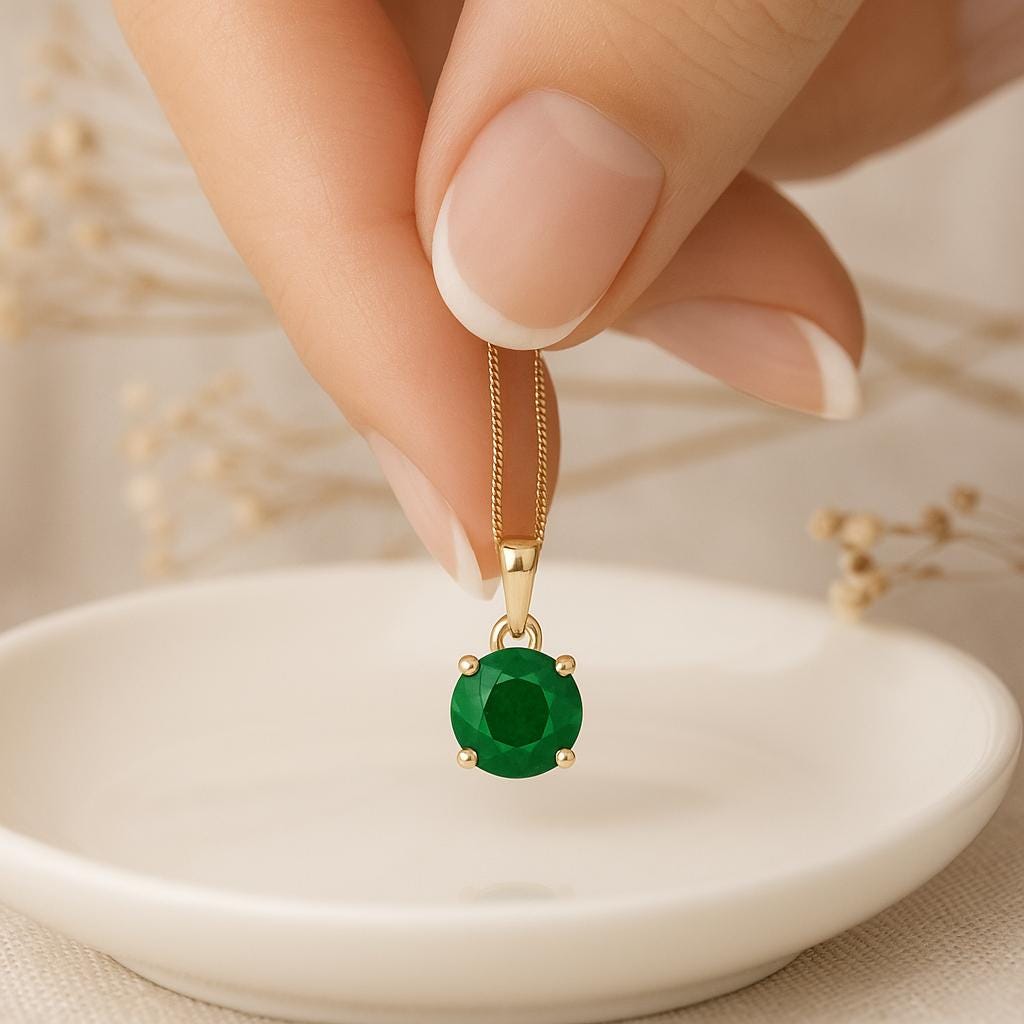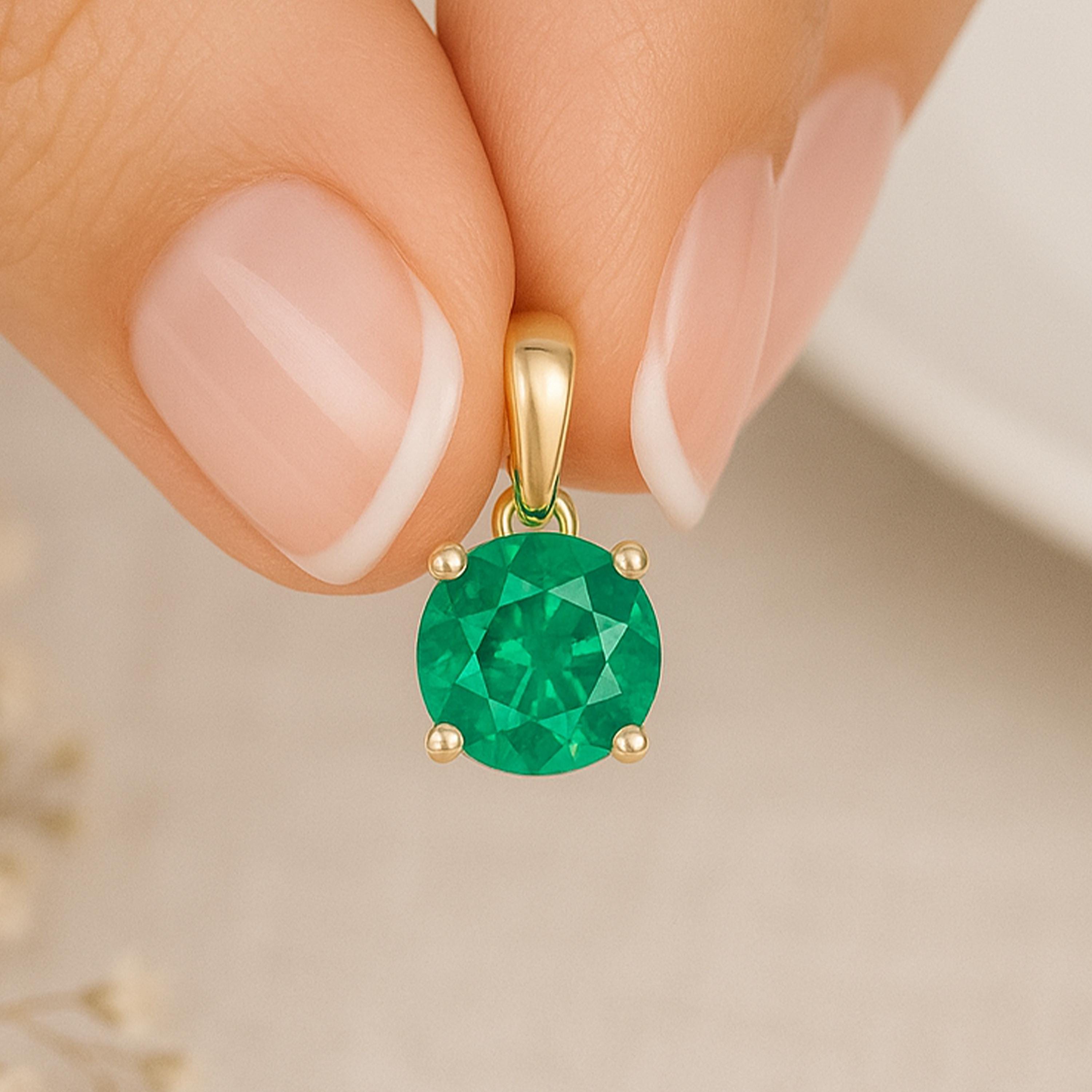 Timeless, vibrant, and deeply symbolic — this natural green emerald pendant is set in solid 9ct yellow gold and catches the light with its classic round cut. A stone of wisdom and renewal, emerald is also the birthstone for May and a powerful talisman of the heart.