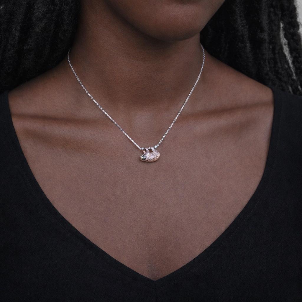 This irresistibly charming sloth necklace is crafted in solid 925 sterling silver and finished in 0.50 micron of 18ct rose gold plate. Lovingly detailed and playfully suspended from a branch-like chain, it captures the relaxed, joyful spirit of our favourite slow-moving friend.