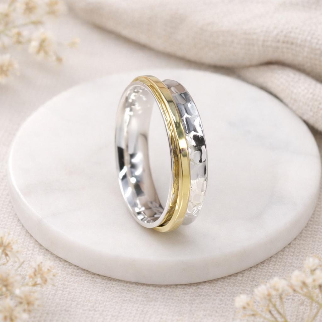 This handcrafted sterling silver and brass spinner ring features a gently hammered 925 sterling silver band with a smooth golden brass spinning band, creating a tactile, calming ring designed for everyday wear.
