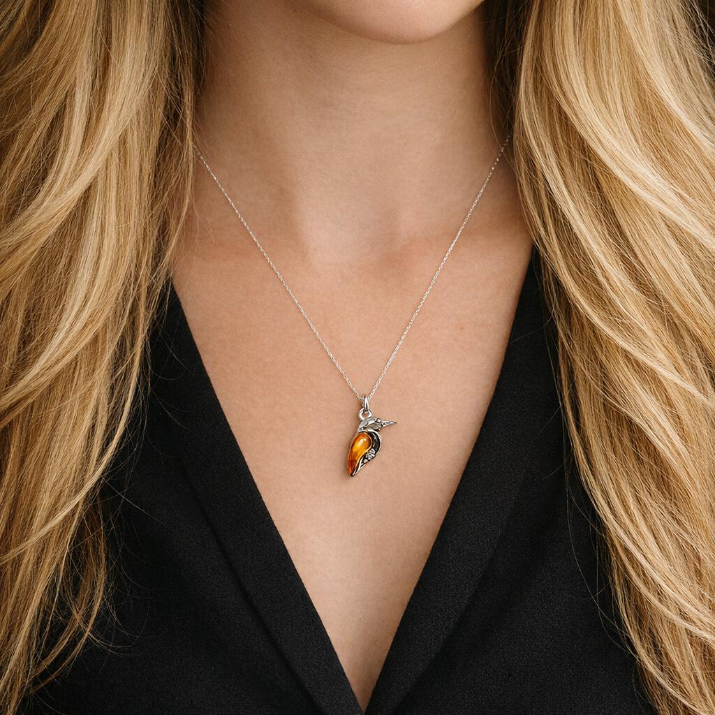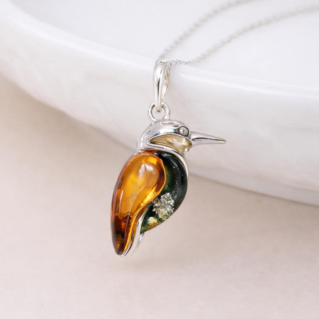 This sterling silver kingfisher necklace is handcrafted from solid 925 sterling silver and set with genuine Baltic amber, creating a beautifully detailed bird pendant inspired by nature.
