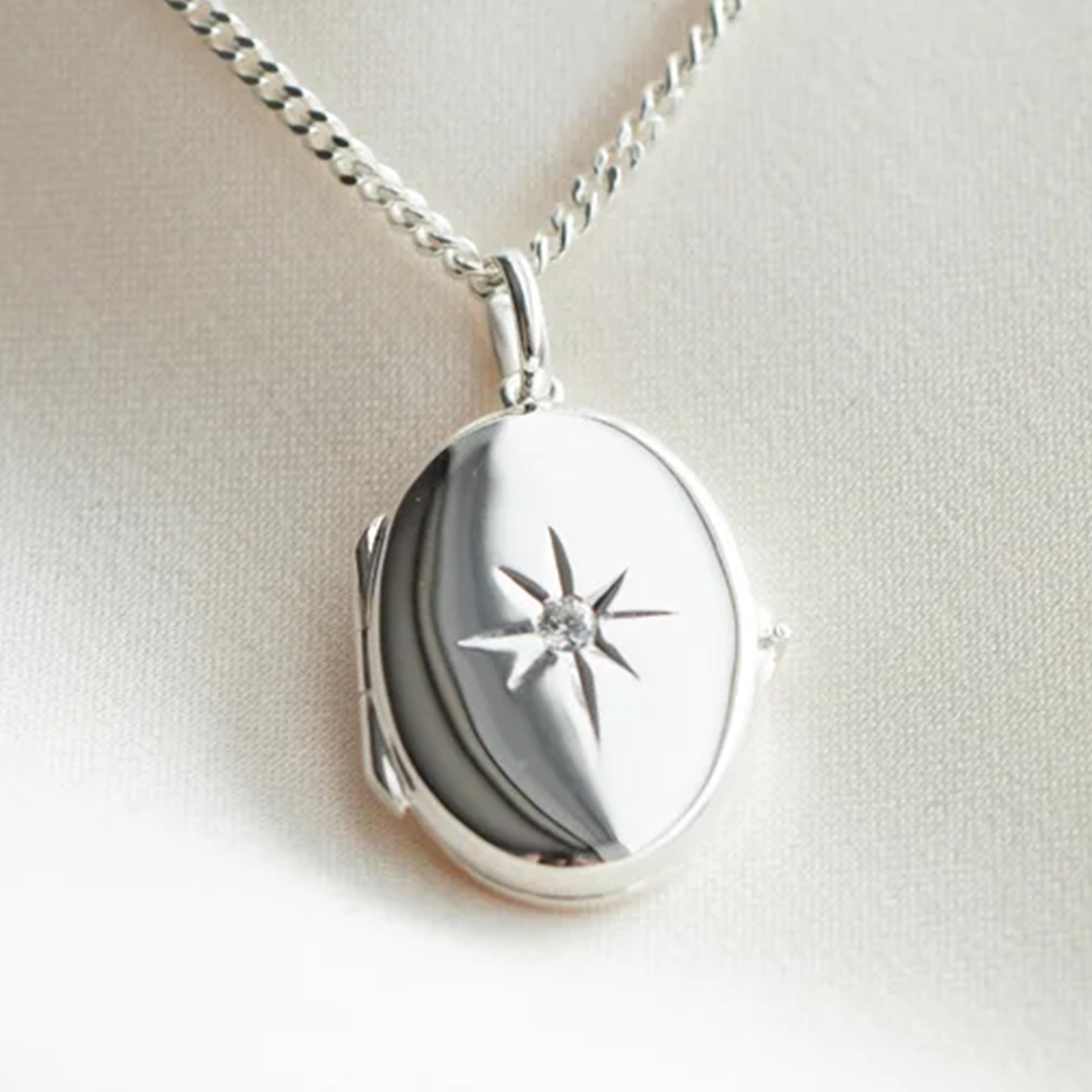This oval starburst locket is made from solid 925 sterling silver and finished in polished silver, featuring a delicate star design on the front and a slightly larger profile to hold a treasured photo or keepsake.