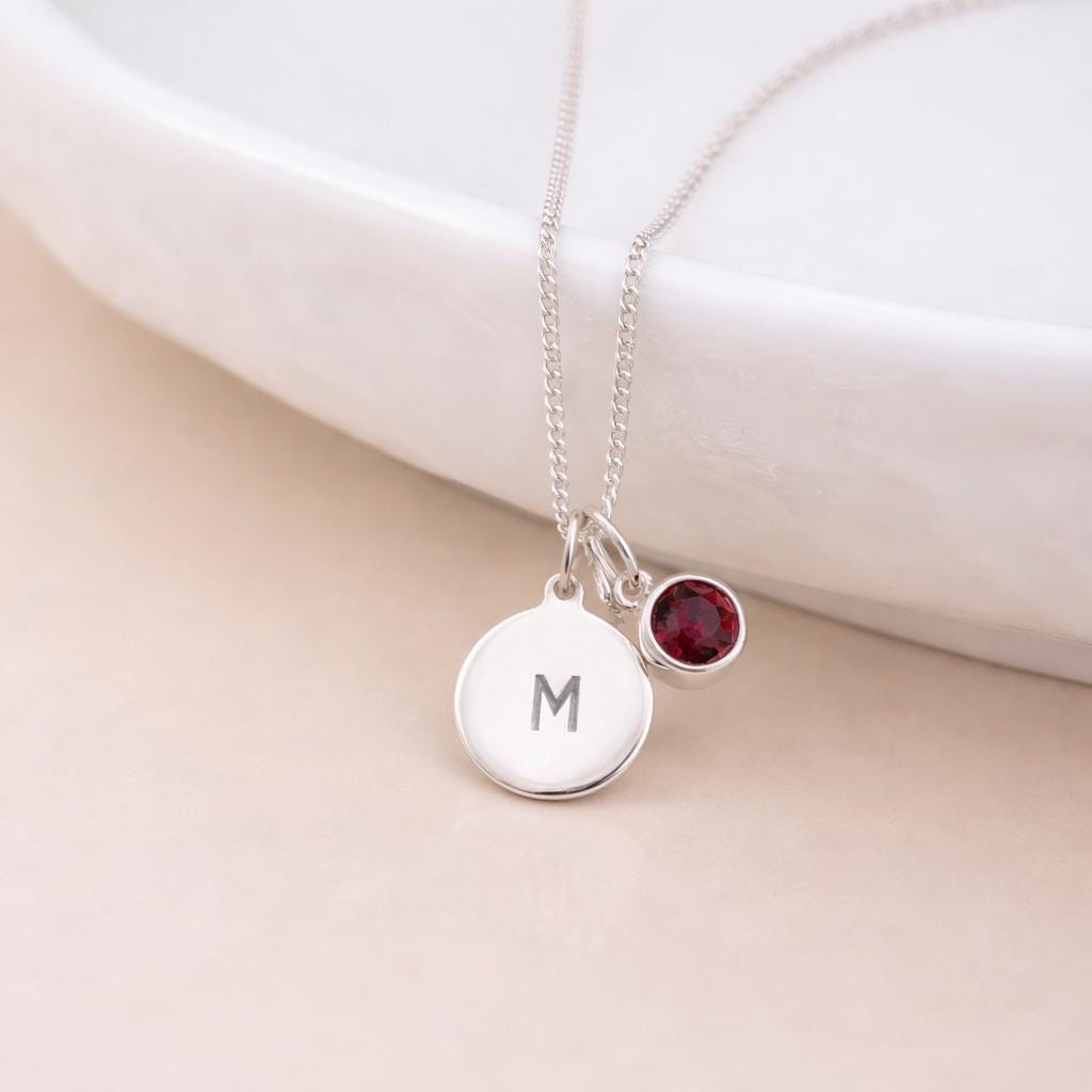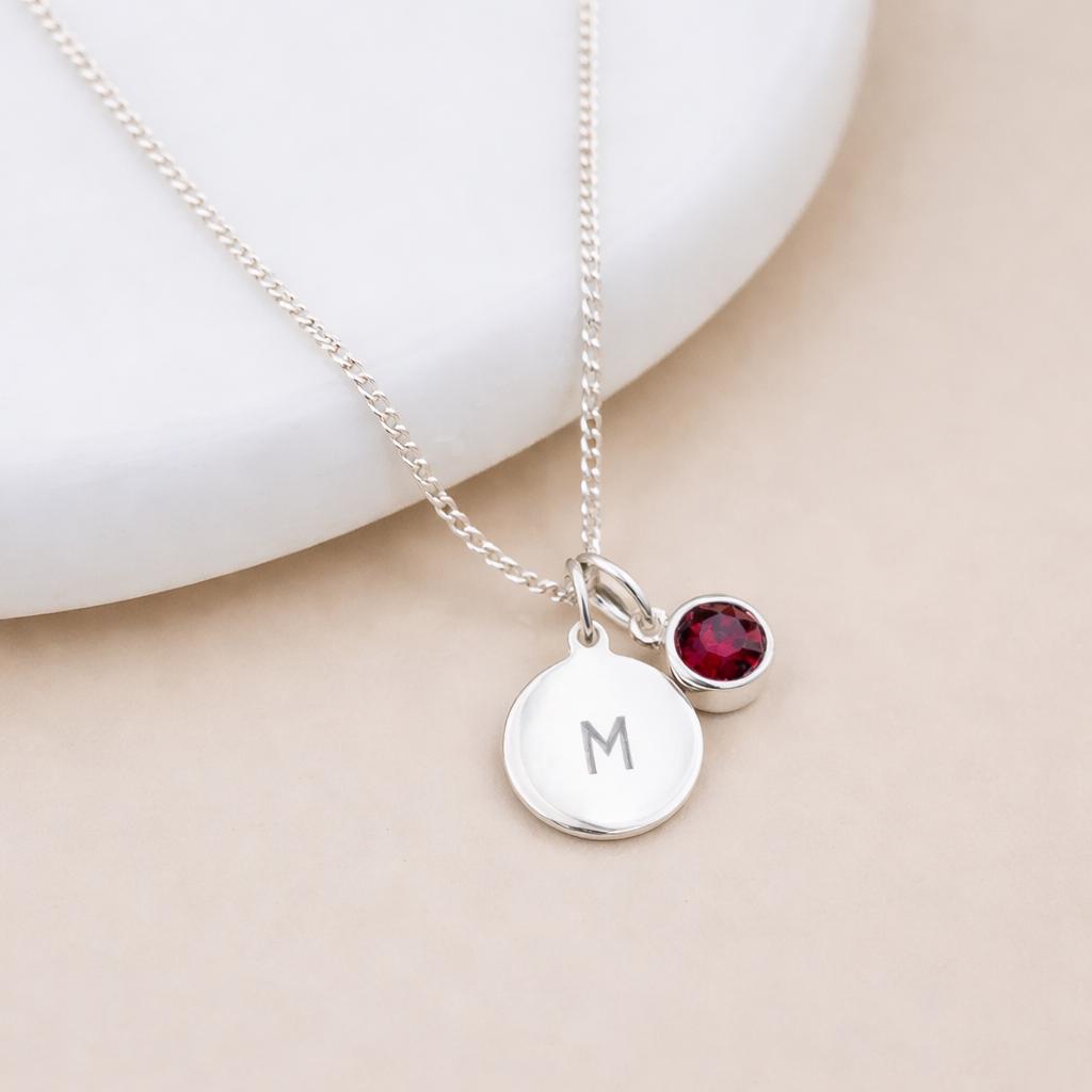 This personalised garnet-coloured birthstone charm necklace is made from solid 925 sterling silver, featuring a deep red cubic zirconia charm, with the option to add an engraved disc for a meaningful, layered keepsake.