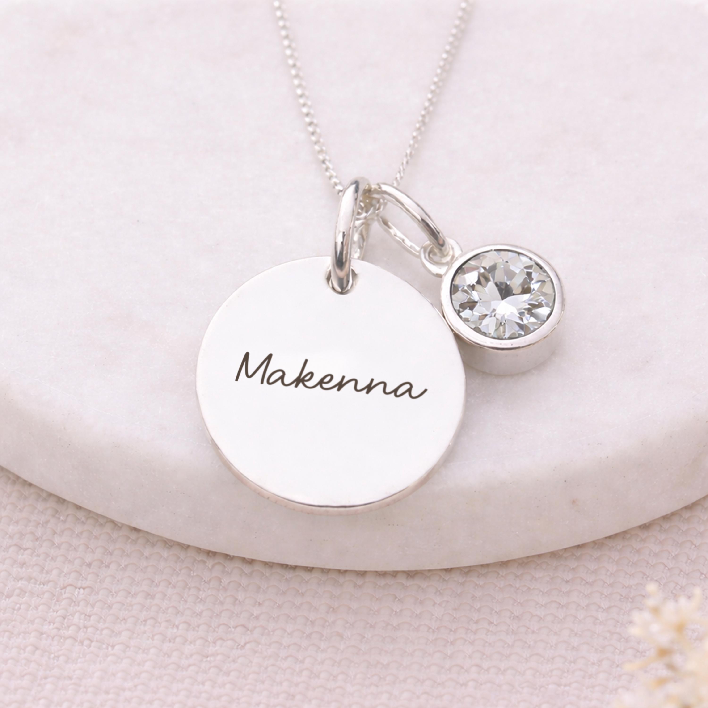 This personalised diamond-coloured birthstone charm necklace is made from solid 925 sterling silver, featuring a clear cubic zirconia charm with the option to add an engraved disc for a meaningful, layered keepsake.