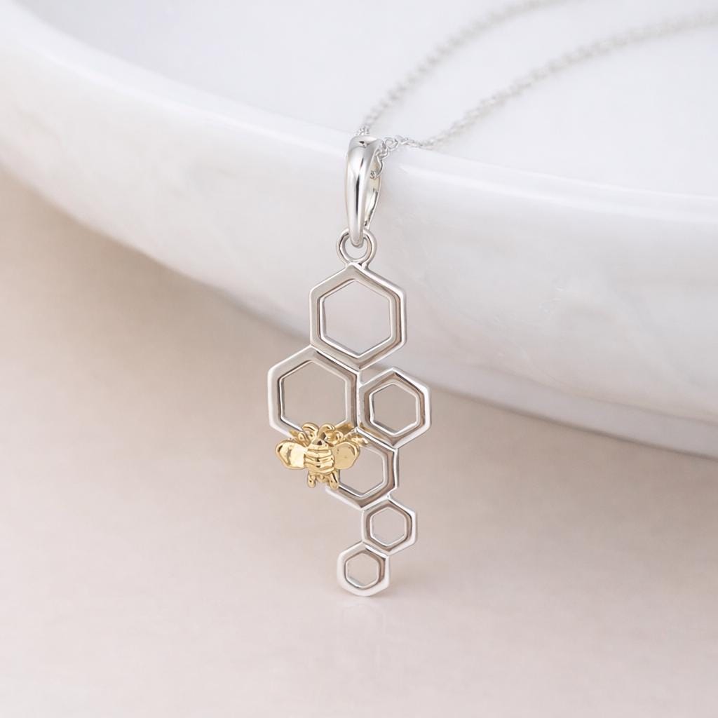 Bees symbolise community, perseverance, and harmony, while the honeycomb pattern represents strength and unity. The combination of cool silver and warm gold tones gives the piece a contemporary two tone finish that pairs beautifully with a wide range of jewellery styles.