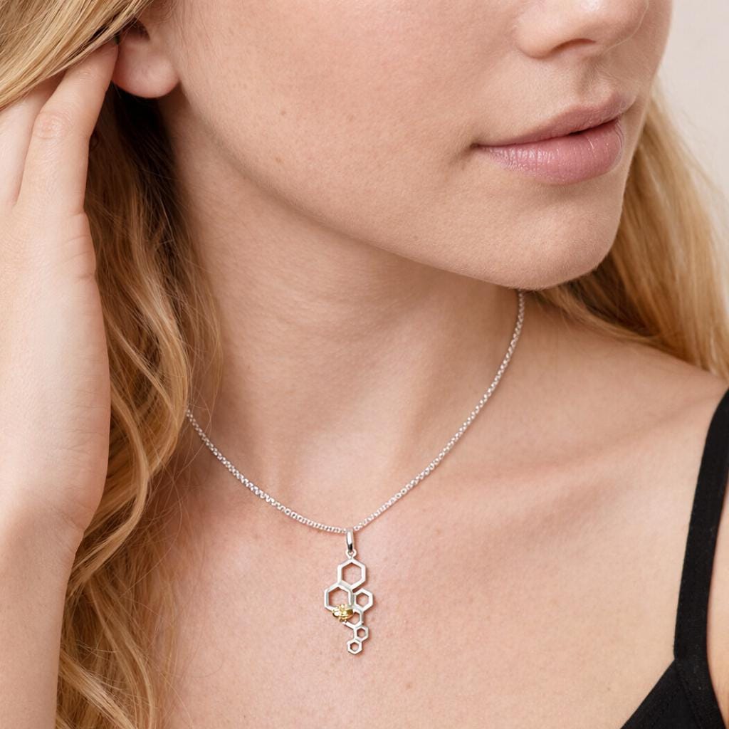 The pendant measures approximately 27mm in height including the bail and 12mm in width, with a depth of around 3mm and a weight of approximately 1.60g, creating a refined yet eye catching silhouette. The open honeycomb framework is formed from interconnected hexagons, reflecting the natural pattern found in beehives. A small 18ct gold plated bee rests within the structure, adding contrast and charm to the polished sterling silver setting.