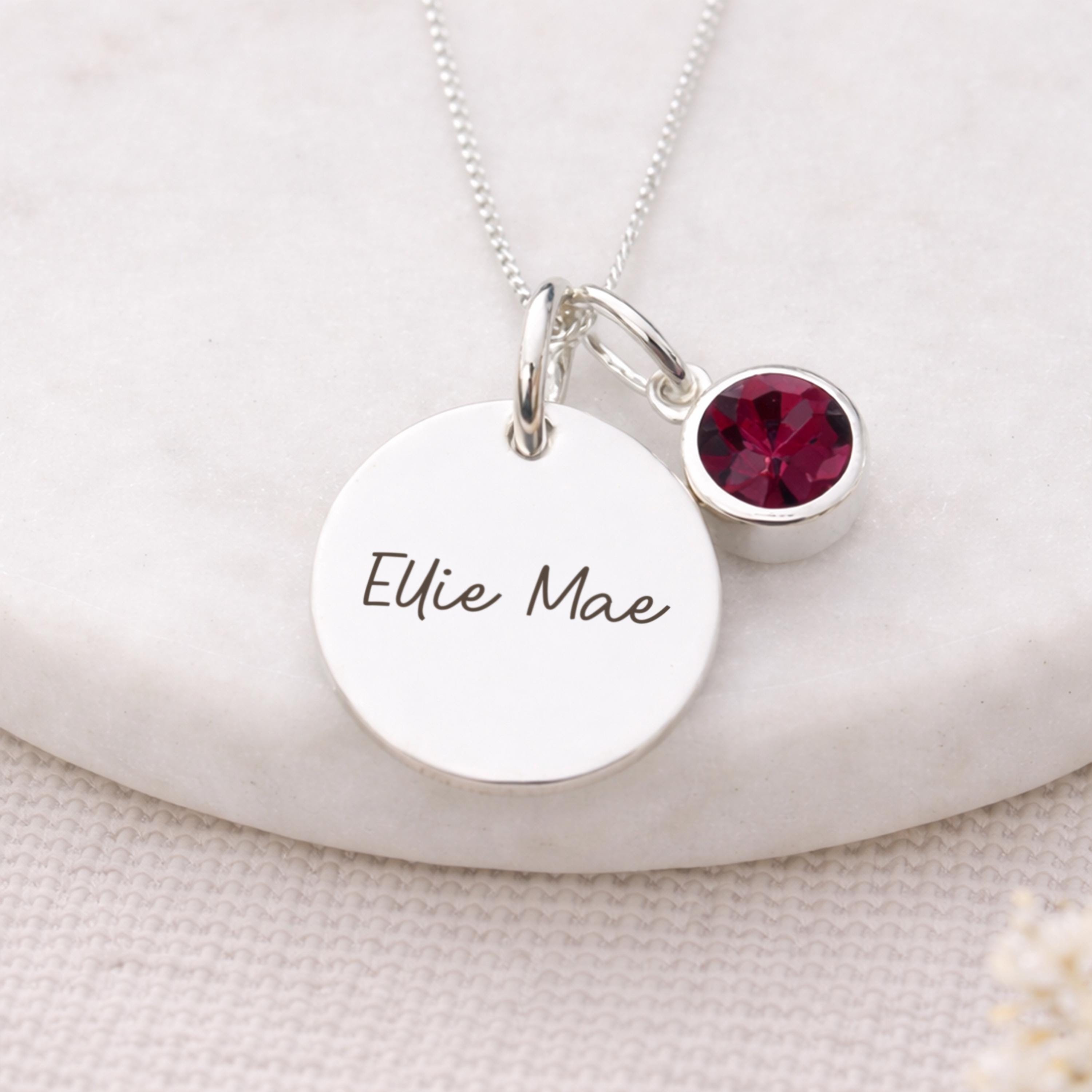 The charm is designed to sit neatly on a chain, offering subtle sparkle without overpowering the look. Alongside the birthstone charm, a separate 15mm sterling silver disc can be added and engraved with a name, initials, date, or short message, allowing you to create a truly personal necklace that celebrates a special moment.