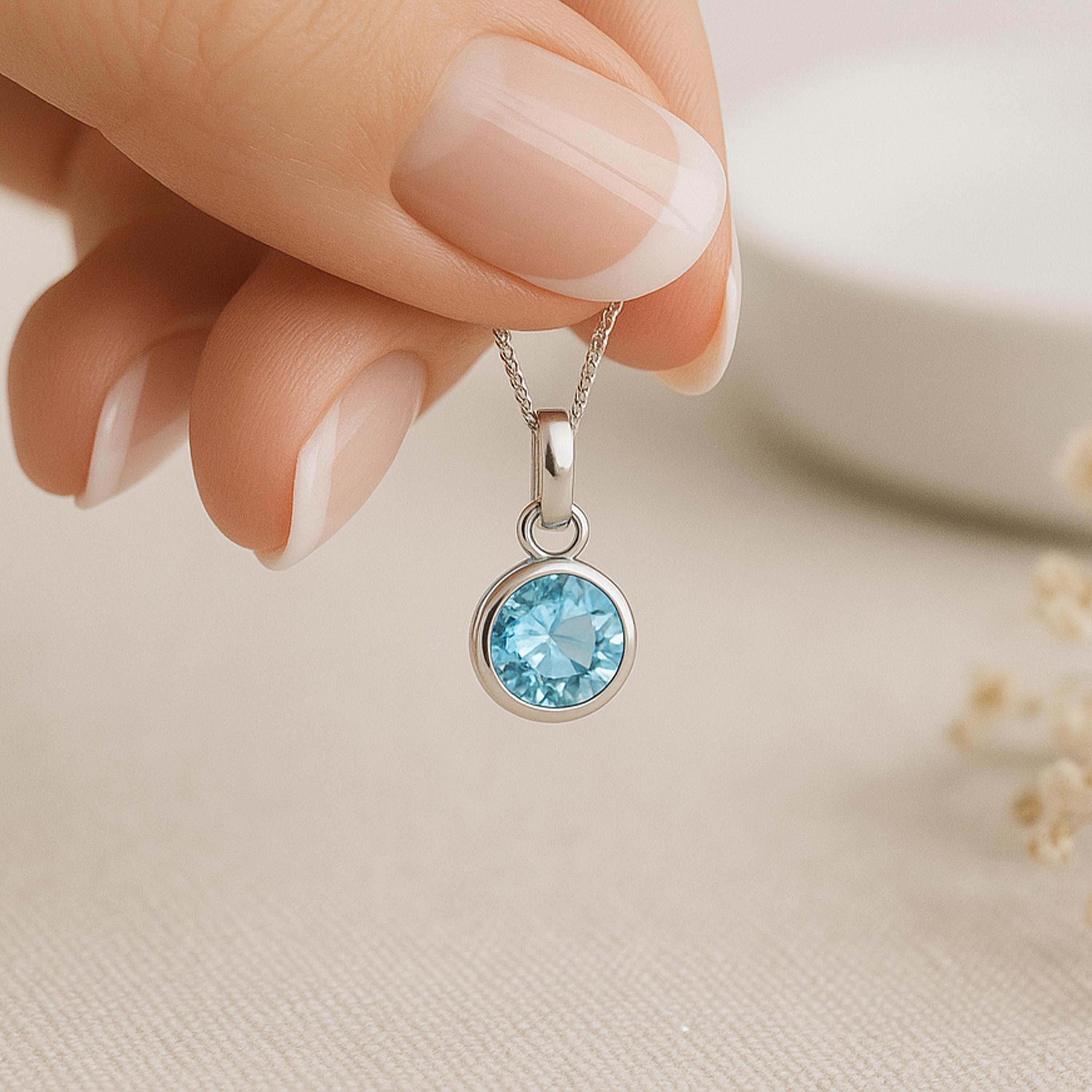 This soft blue March birthstone charm features an aquamarine-coloured cubic zirconia set in polished solid 925 sterling silver. Symbolising calm, clarity, and protection, aquamarine is the perfect token for March birthdays or those drawn to its ocean-inspired serenity.