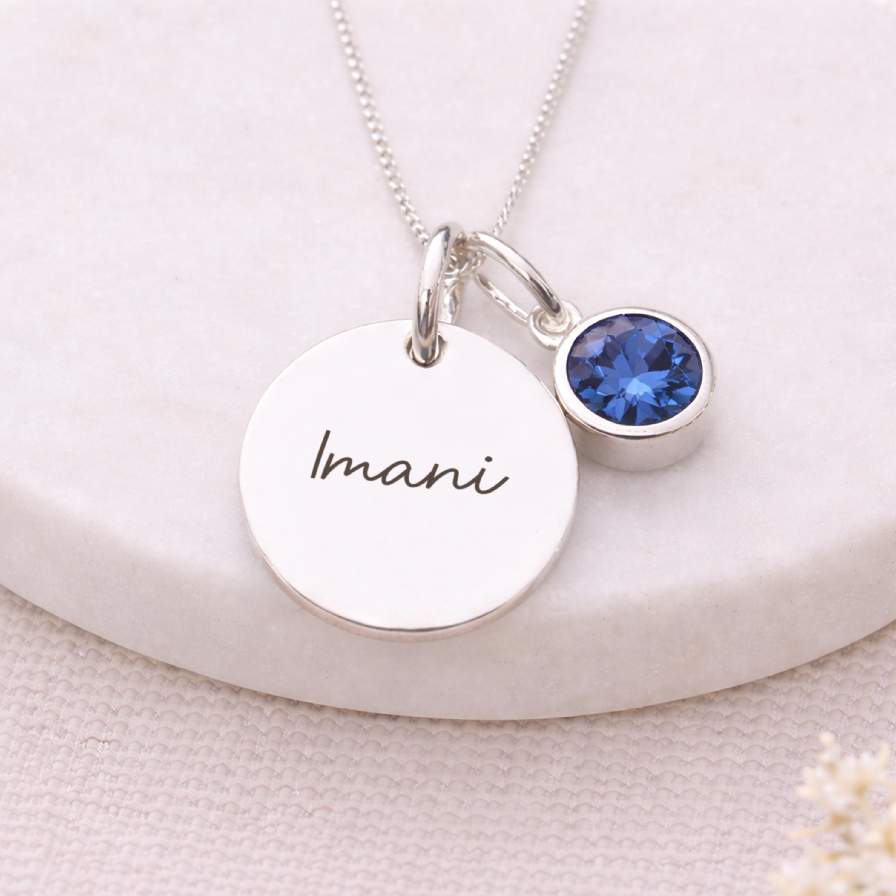 This personalised sapphire coloured birthstone charm necklace is made from solid 925 sterling silver, featuring a deep blue cubic zirconia charm with the option to add an engraved disc for a meaningful, layered keepsake.