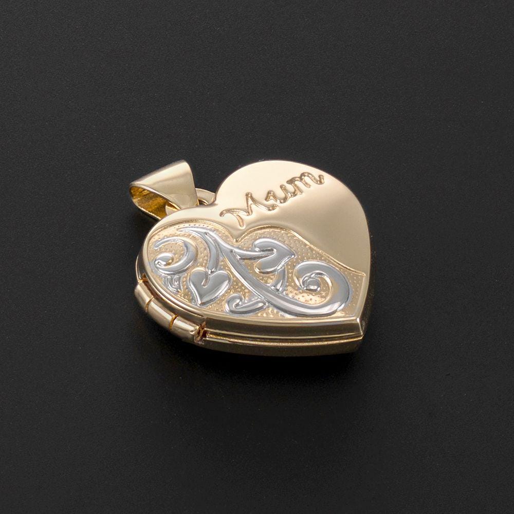 This is a heart-shaped hallmarked 9ct yellow gold keepsake locket for Mum, with space for a personal message on the back and two photos inside.