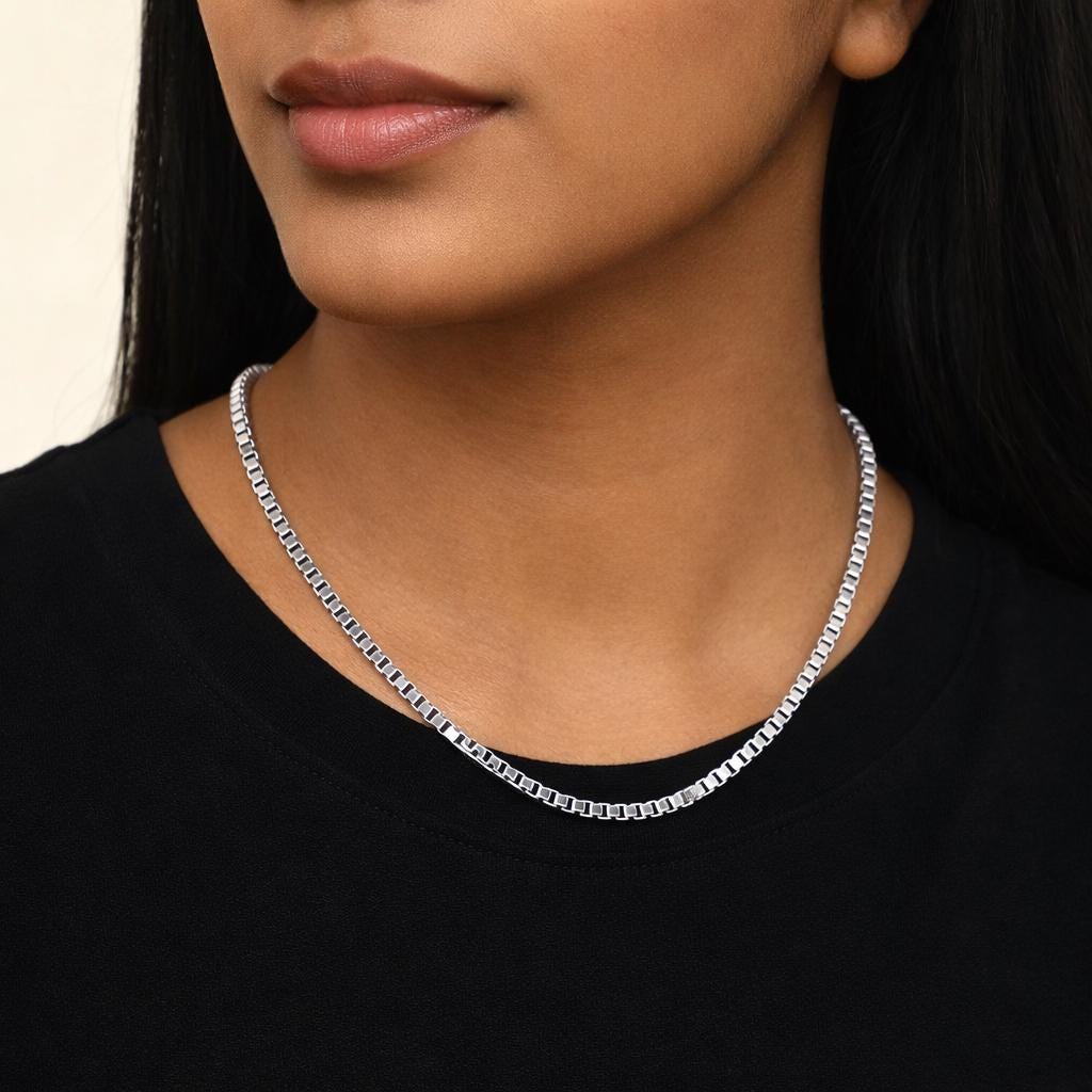 This sterling silver box chain necklace is crafted from solid 925 sterling silver and finished with a bright, polished shine, creating a strong, structured chain designed for everyday wear.