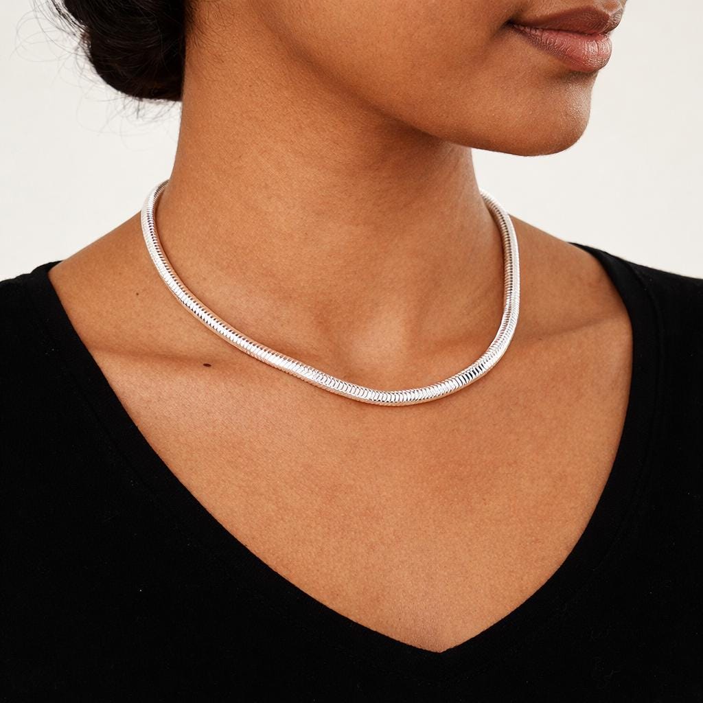 ♡ Style Tip: This wide snake chain looks best worn on its own to let the smooth silver surface take centre stage. Pair it with minimalist outfits, open necklines, or tailored pieces for a confident, contemporary look.