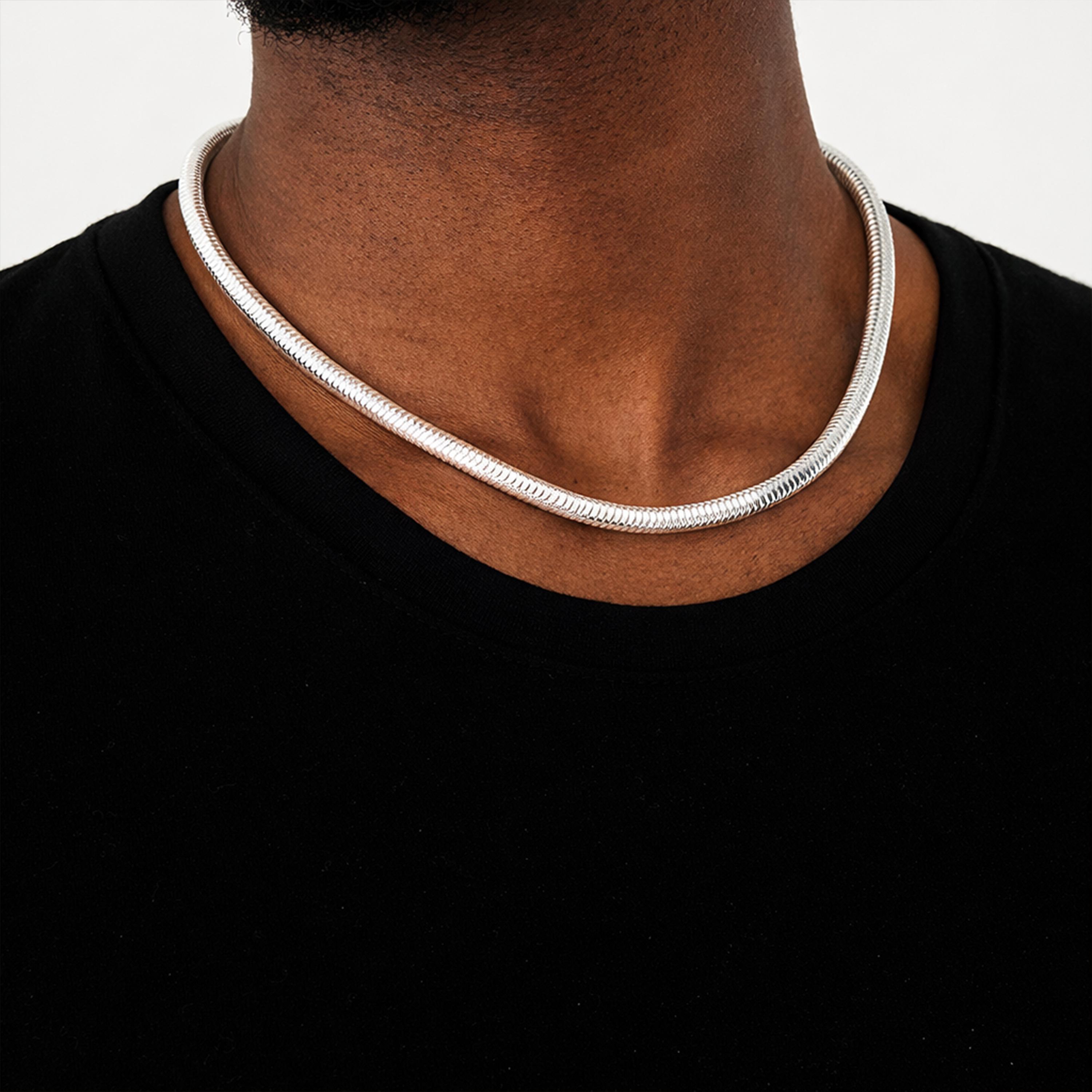 The snake chain is made from tightly interlinked segments that form a flexible, fluid structure, allowing the necklace to sit flat and comfortably against the skin. At 5mm wide, this chain has a strong, confident presence, making it ideal for wearing alone as a statement necklace. Its sleek profile and clean lines give it a modern, sculptural feel that elevates even the simplest outfit.