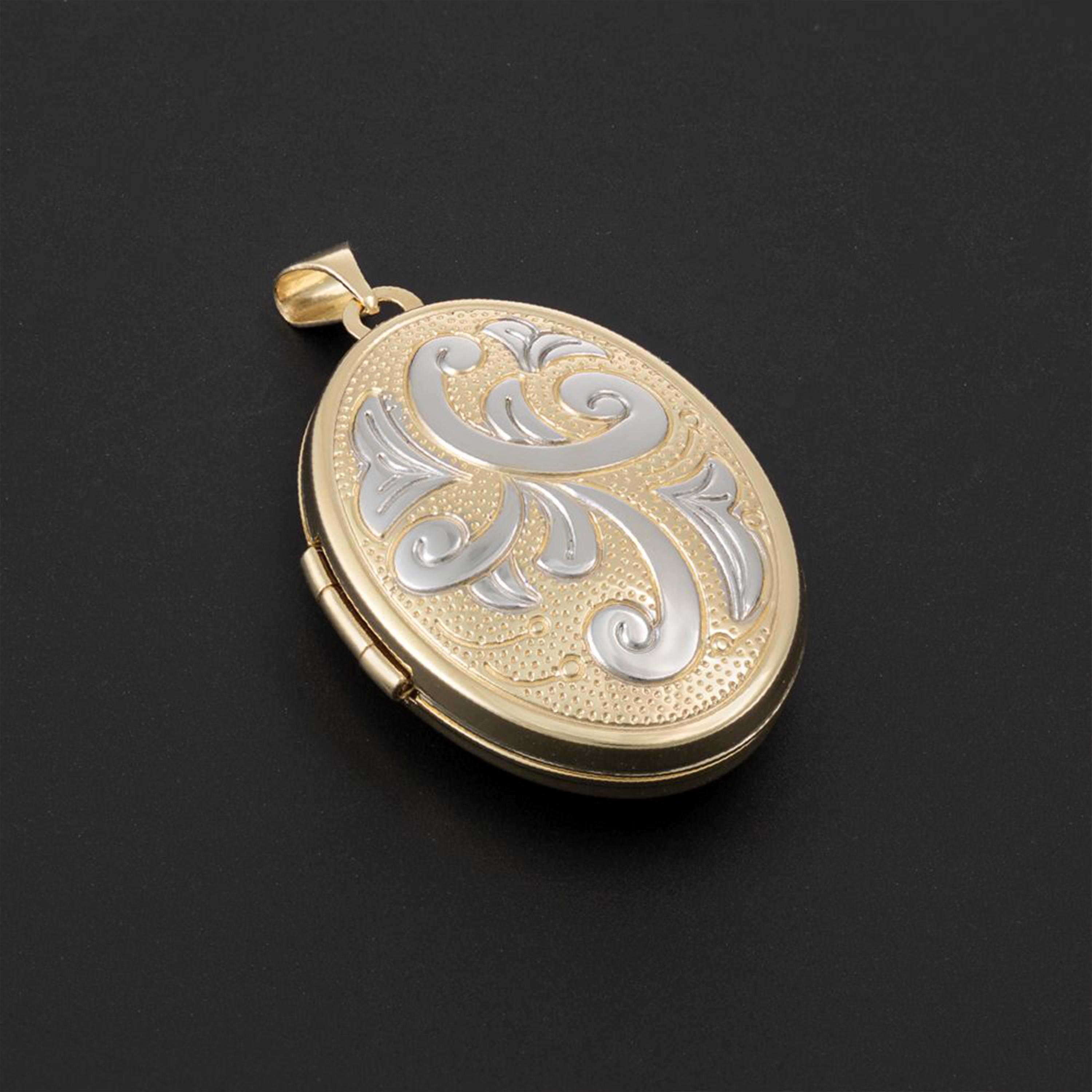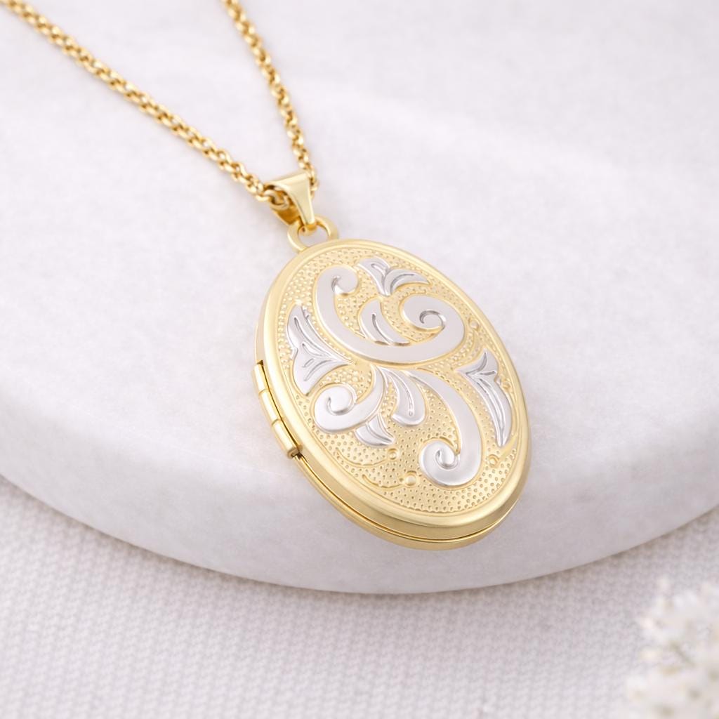 The front of the locket features an intricate engraved design, inspired by traditional vintage motifs and finished with a mix of polished and textured surfaces that catch the light softly. The oval locket opens to hold a small photograph or keepsake, making it a meaningful piece designed to be treasured for years to come. Despite its detailed appearance, the locket feels lightweight and comfortable when worn, perfect for everyday elegance or special occasions.