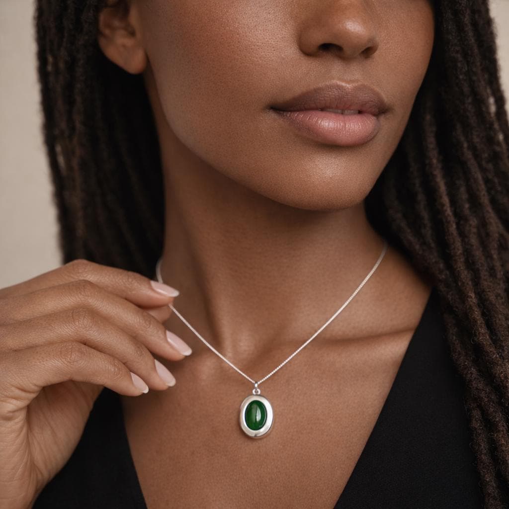 Each locket is thoughtfully made using traditional jewellery techniques, with a smooth, weighty feel that reflects its quality and durability. The oval locket opens to reveal space for two photos, making it a deeply personal keepsake piece, perfect for holding loved ones, memories, or meaningful moments. The smooth silver surround is intentionally kept minimal to allow the jade to take centre stage.