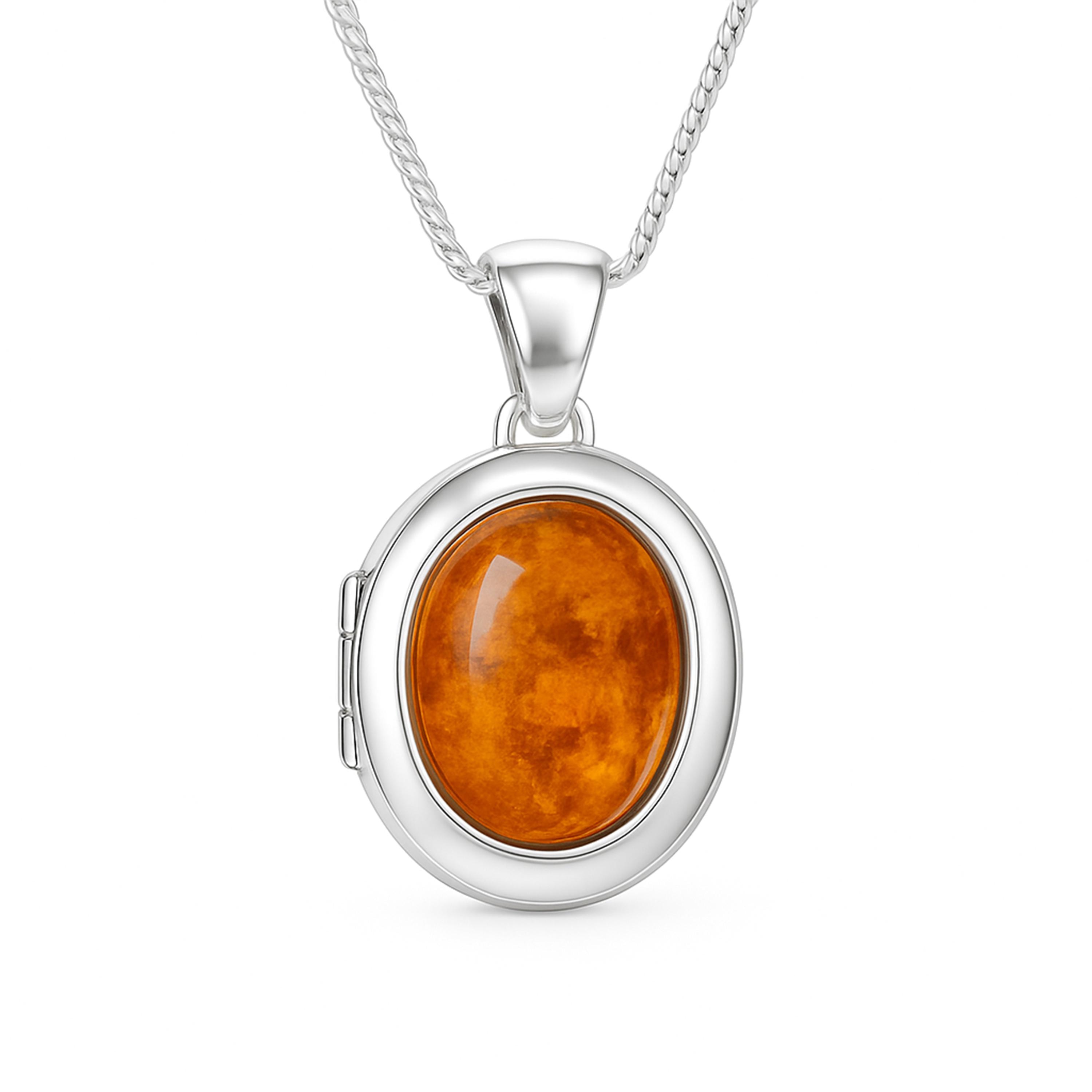 This beautifully handcrafted locket necklace features a natural Baltic amber gemstone set in polished sterling silver. With its rich, honeyed tones and organic charm, it’s a timeless piece that’s perfect for any age.