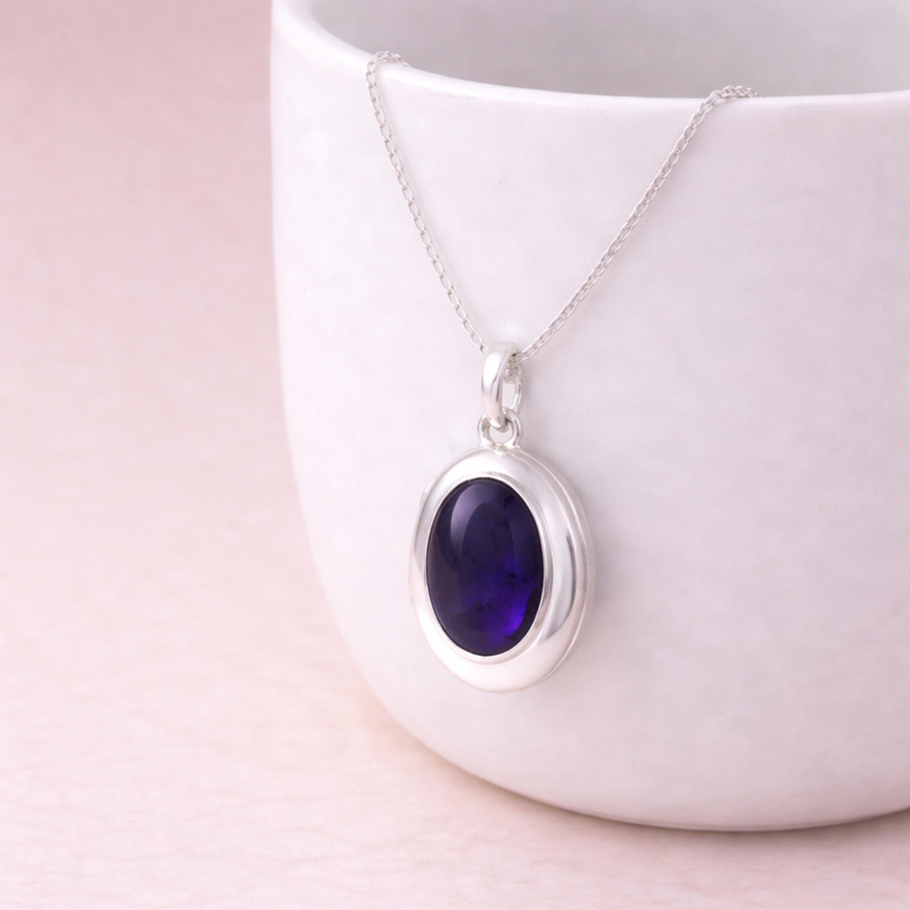 Perfect as an iolite locket necklace, unique gemstone locket, or personalised keepsake gift, this design blends subtle colour with timeless sentiment.