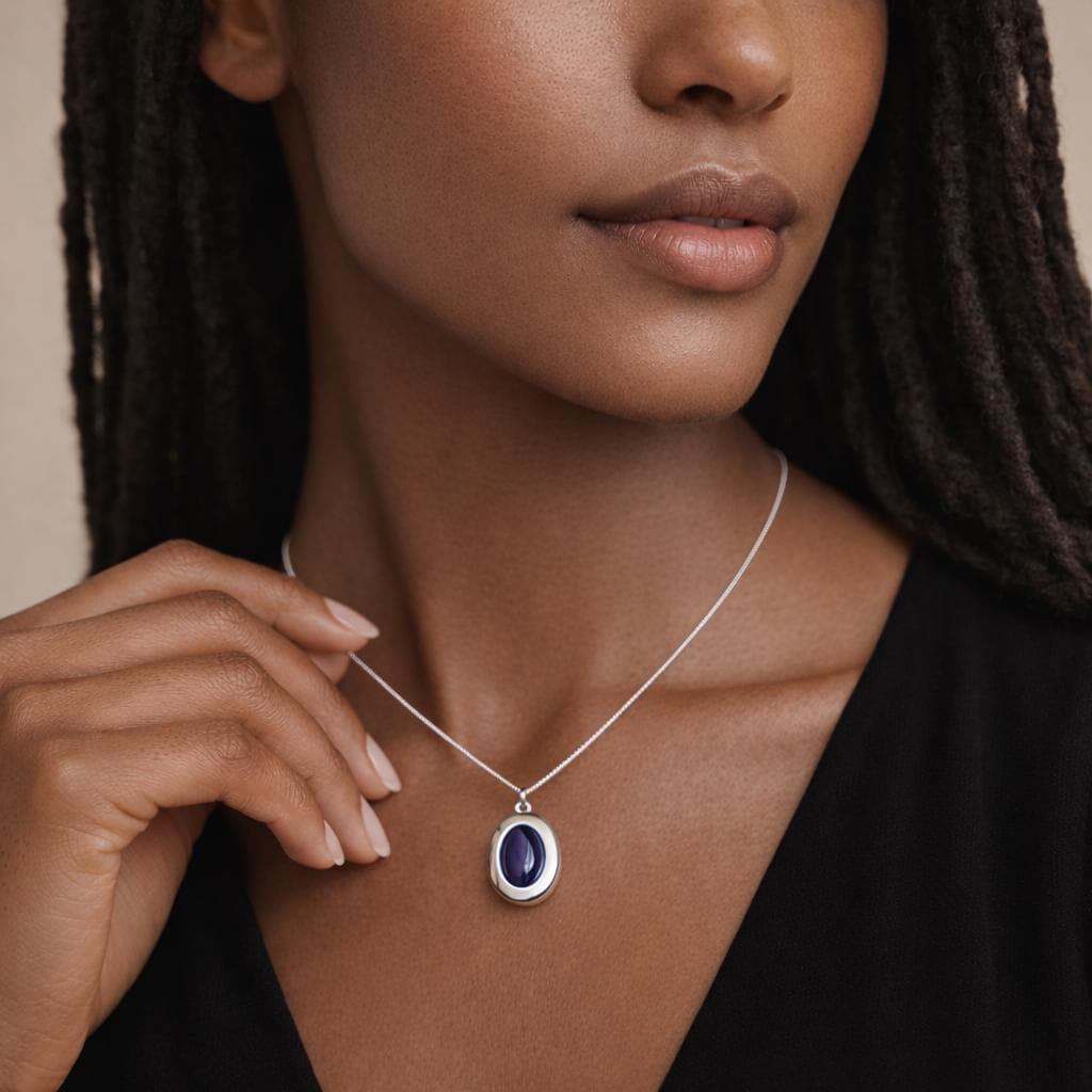 Each locket is thoughtfully made using traditional jewellery techniques, with a smooth, weighty feel that reflects its quality and durability. The oval locket opens to reveal space for two photos, making it a deeply personal keepsake piece, perfect for holding loved ones, memories, or meaningful moments. The smooth silver surround is intentionally kept minimal to allow the purple iolite to take centre stage.