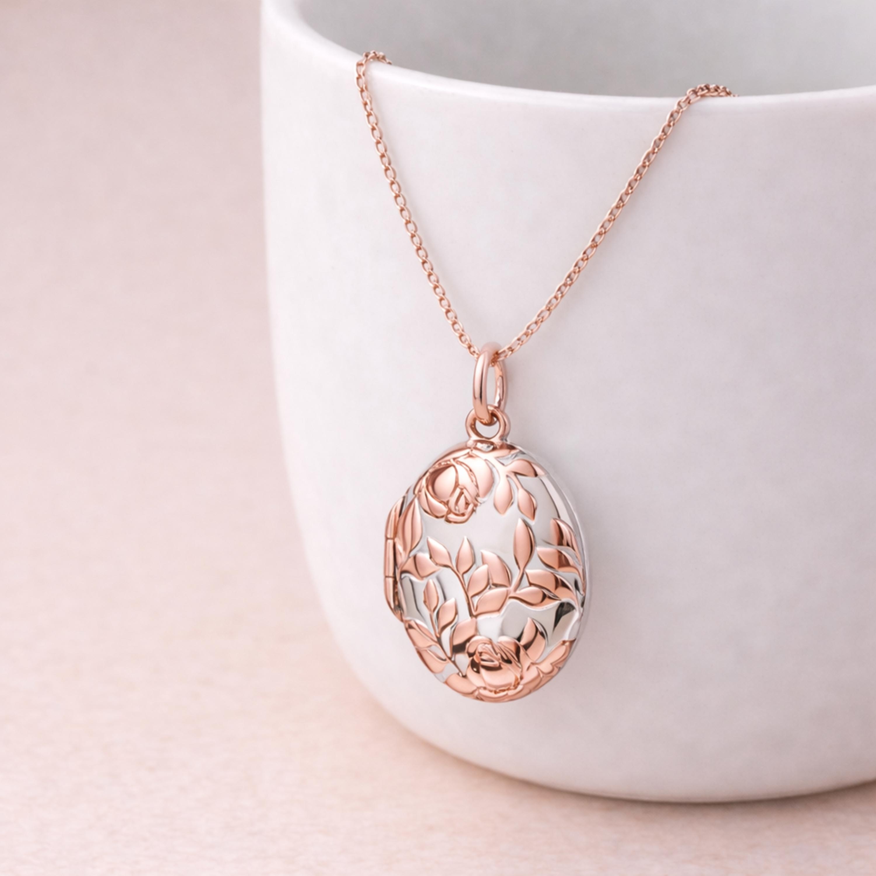 This oval rose locket is made from solid 925 sterling silver with 18ct rose gold accents and finished in a soft silver and rose gold tone, designed to hold a treasured photo or keepsake close to the heart.